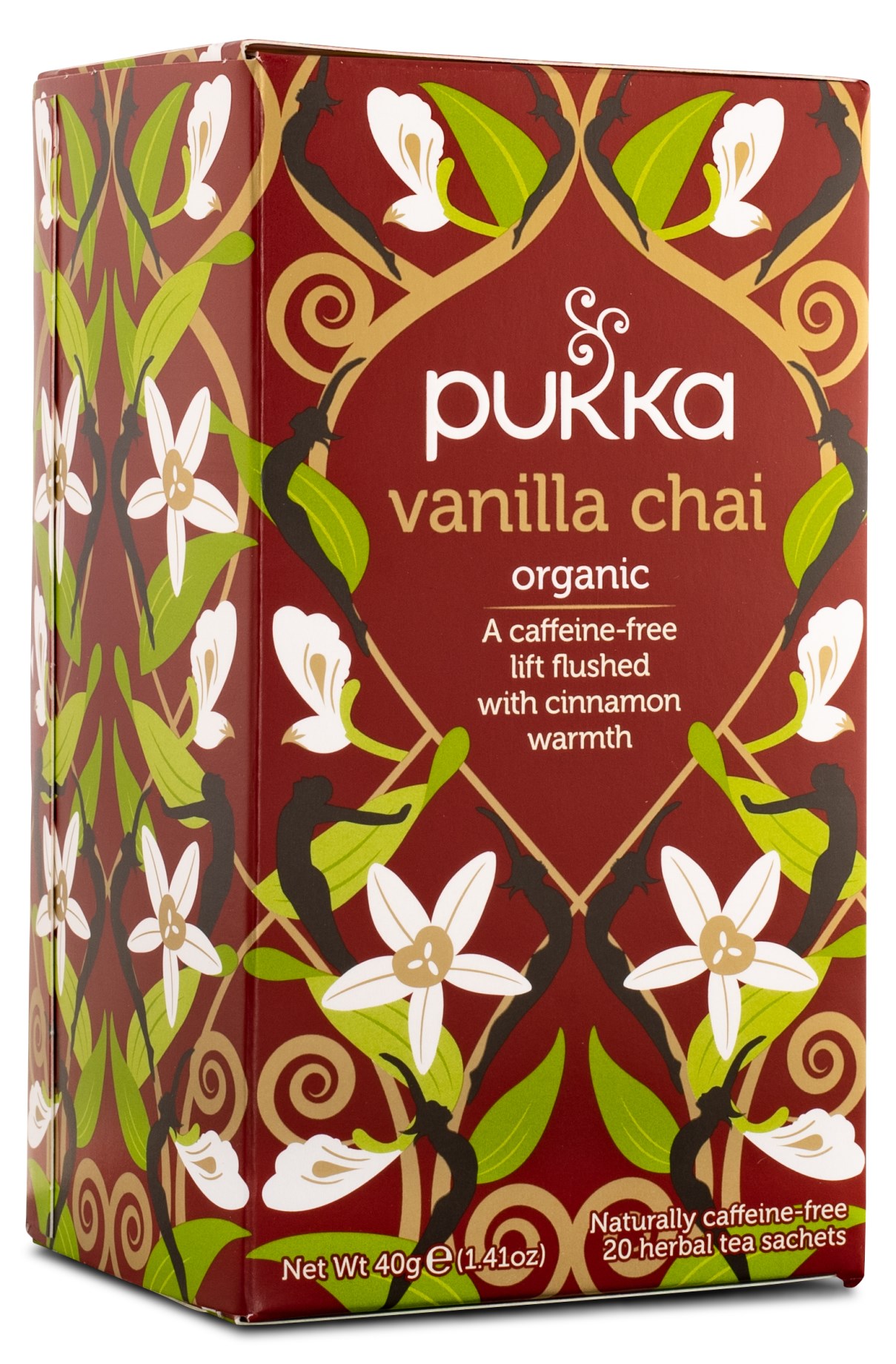Pukka Te Vanilla Chai EKO är ett smakrikt te med bland annat lakrits, vanilj, kryddig kanel och ingefära; en riktig fröjd för smaklökarna! Teet är fritt från koffein, och alla ingredienser är ekologiska och rättvisemärkta (fairtrade) - ett bättre val helt enkelt.