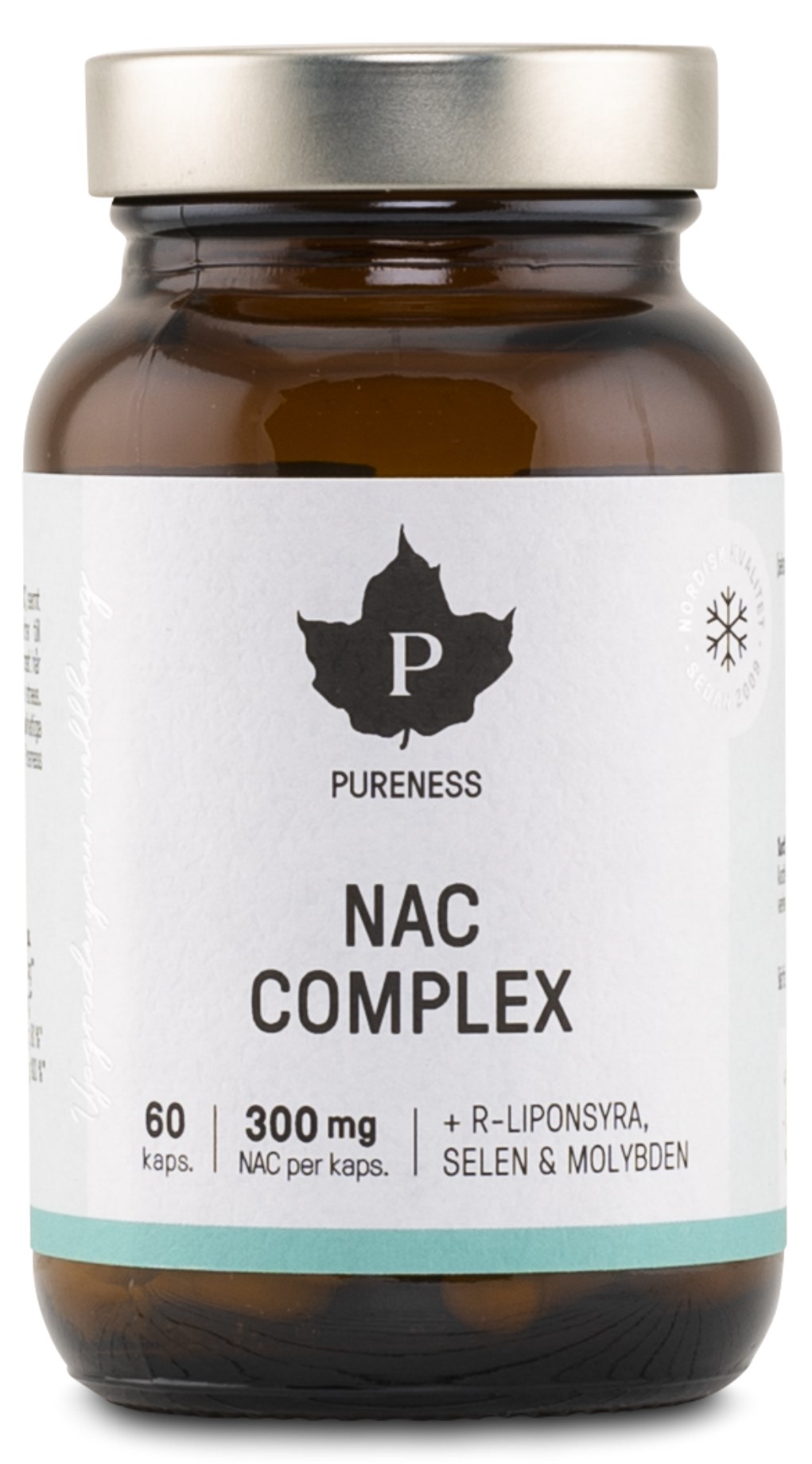 NAC Complex från Pureness är ett aminosyrapreparat av hög kvalitet, som innehåller N-acetyl-L-cystein (NAC) samt aktiv R-liponsyra, selen och molybden. Selen bidrar till immunsystemets normala funktion, till att bibehålla normalt hår och naglar, och dessutom till att skydda cellerna mot oxidativ stress. Molybden bidrar till normal omsättning av svavelhaltiga aminosyror. Kombinera gärna NAC Complex med Pureness C-vitamintillskott.