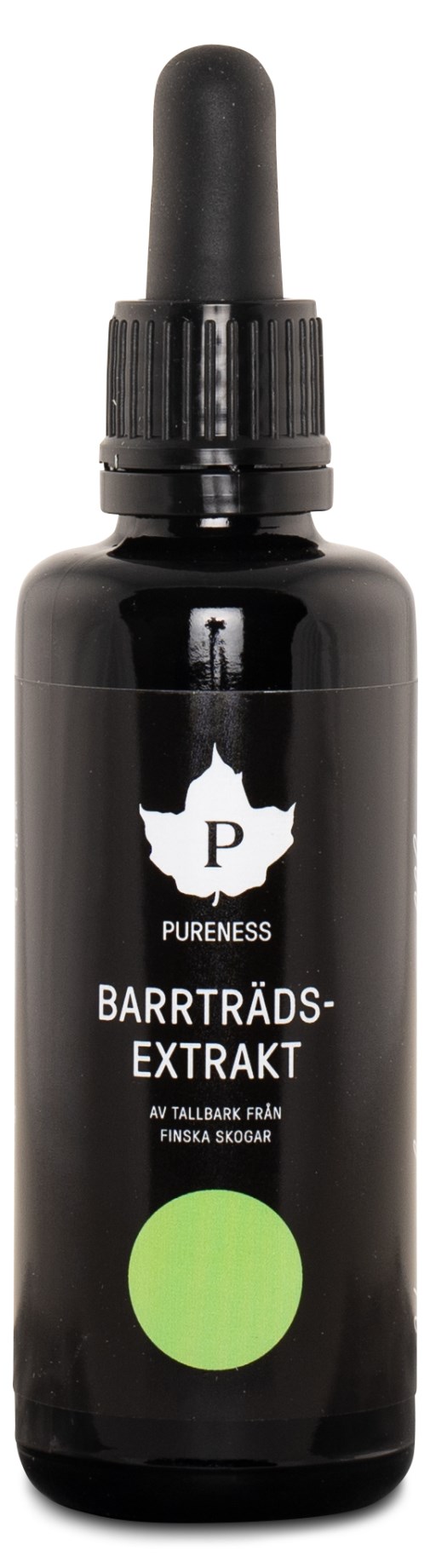 Pureness Premium Research Barrträdsextrakt är ett extrakt som innehåller många nyttiga ämnen. Här återfinns resveratrol, som fungerar som antioxidant, bioflavonoider, tidigare kallat P-vitamin, och proantocyanidiner (OPC). Extraktet är gjort på tallbark som har skördats för hand från tallar i norra Finland, där de växt långt från utsläpp och industrier. Blanda det högpotenta extraktet i juice, smoothie eller kaffe för extra näring.