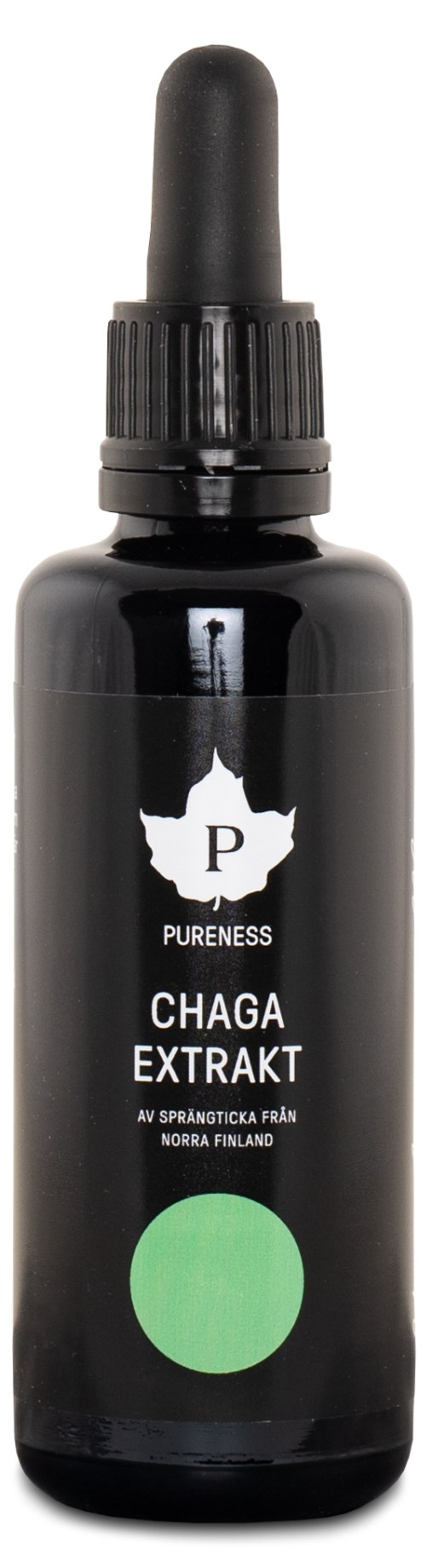 Premium Research Chaga Extrakt från Pureness är ett flytande extrakt från svampen sprängticka (Inonotus Obliquus). Svampen växer vilt på trädstammen på björkar och har ett mycket positivt rykte. Chaga innehåller många näringsämnen, bland annat magnesium, zink, kalcium och selen samt polysackarider, antioxidanter, flavonoider, mineraler och enzymer. För att få ut alla näringsämnen ur sprängtickan har de dubbelextraherats med både vatten och alkohol. Det gör tinkturen mer än sex gånger så potent än vanligt chaga-te så det räcker med endast en liten dos som droppas i valfri vätska.
