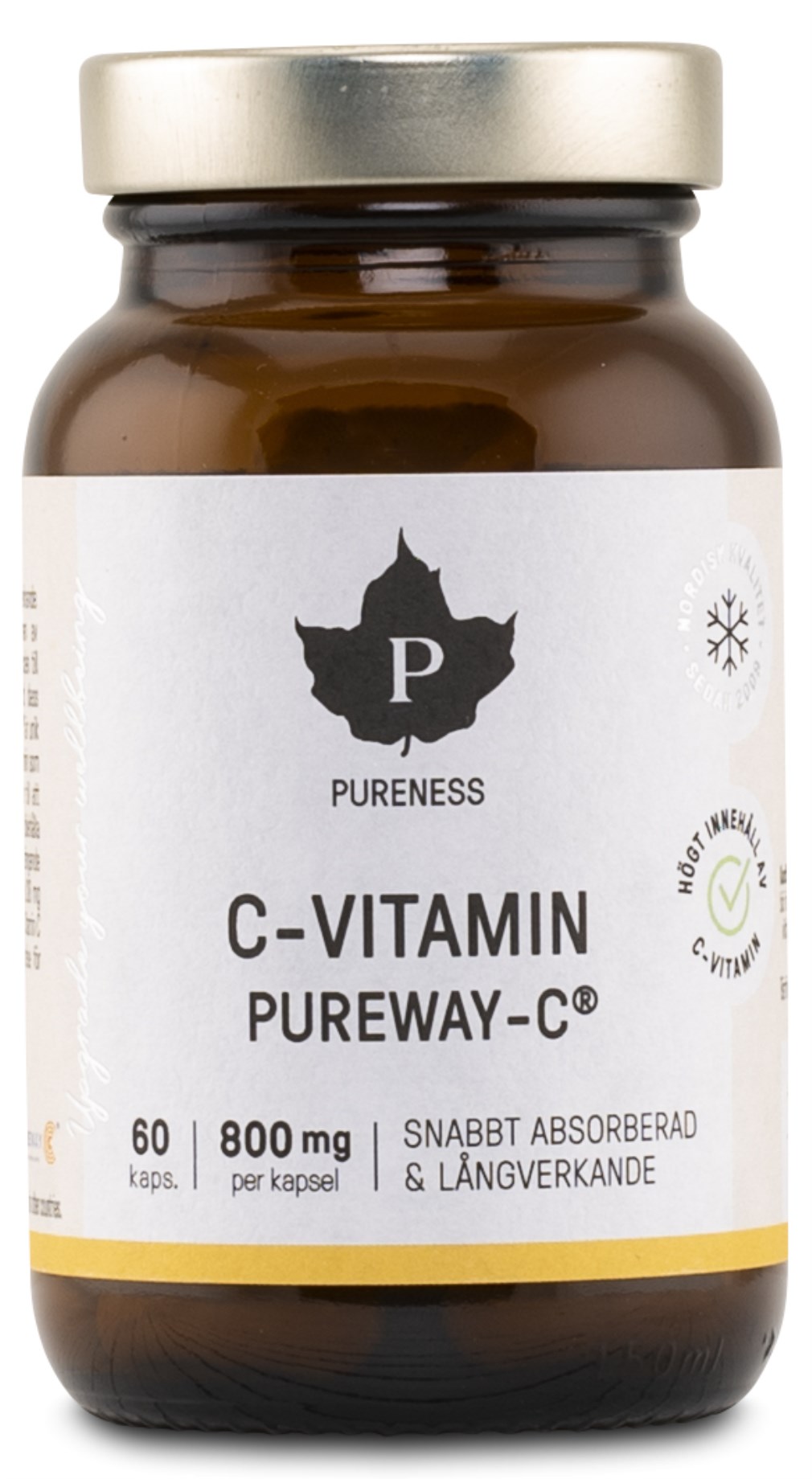 Pureness Pureway Vitamin C är ett tillskott i kapselform av vitamin C, från den vetenskapligt undersökta formen PUREWAY-C®. Askorbinsyran i tillskottet bundet till fettsyror för att förbättra upptaget och utnyttjandet av vitaminet i kroppen. Vitamin C bidrar till att minska trötthet samt till immunsystemets normala funktion.