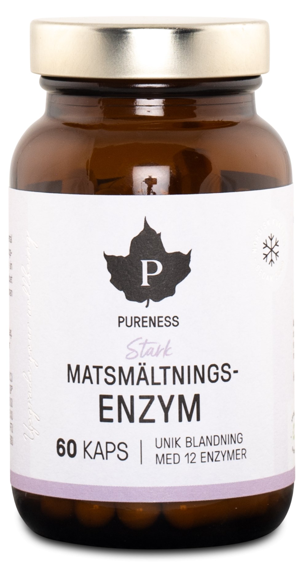 Stark Matsmältningsenzym från Pureness hjälper till att omvandla mat till näring genom att bryta ner kolhydrater, protein och fett i kroppen. Pureness Stark Matsmältningsenzym innehåller 12 noga utvalda enzymstammar. Tekniken som använts för att framställa enzympreparatet gör att enzymerna klarar av både mycket sura miljöer och mycket basiska miljöer.