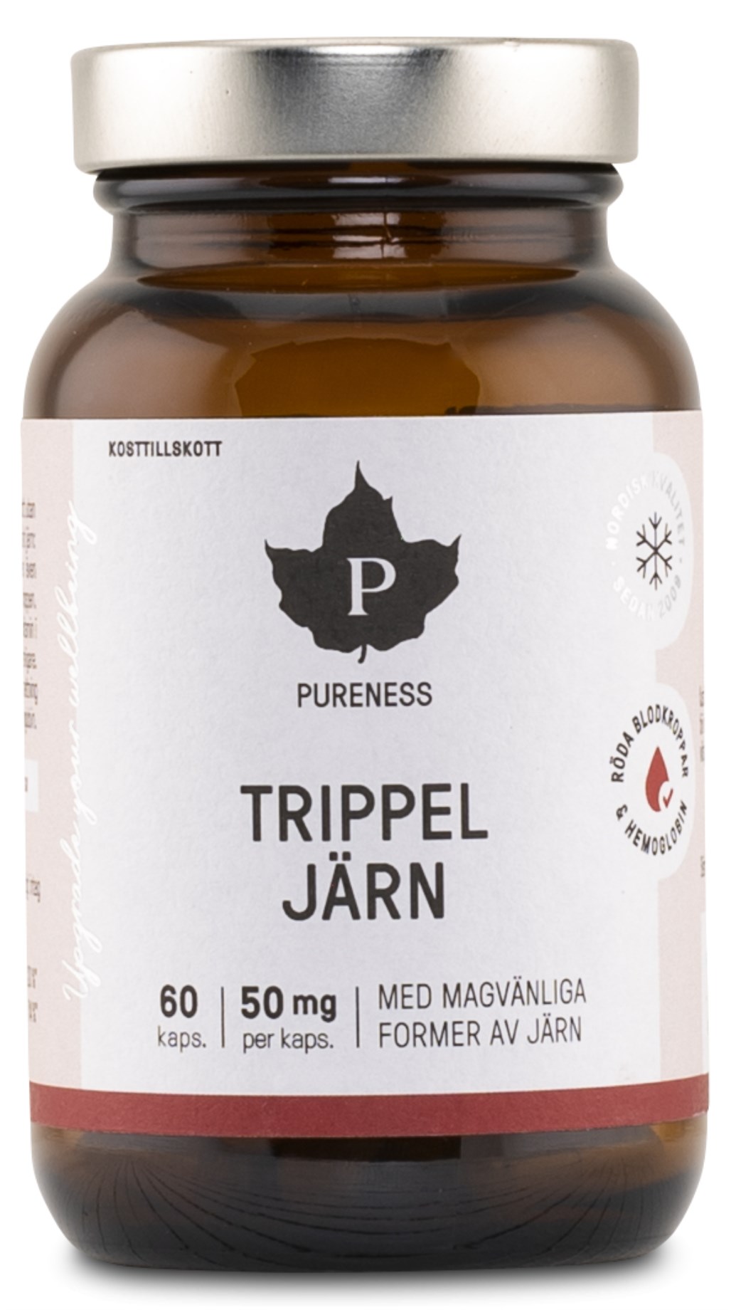Pureness Trippel Järn är ett kraftfullt järntillskott som kombinerar två högkvalitativa former av järn: järnbisglycinat och järnfumarat. Den tredje komponenten, laktoferrin, är ett naturligt förekommande glykoprotein i kroppen som innehåller betydande mängder järn och som även spelar en roll i transporten av järn i kroppen. För att ytterligare förbättra upptaget innehåller tillskottet även vitamin C. Järn är avgörande för normal energiomsättning och immunsystemets funktion, minskar trötthet och stödjer bildandet av röda blodkroppar.