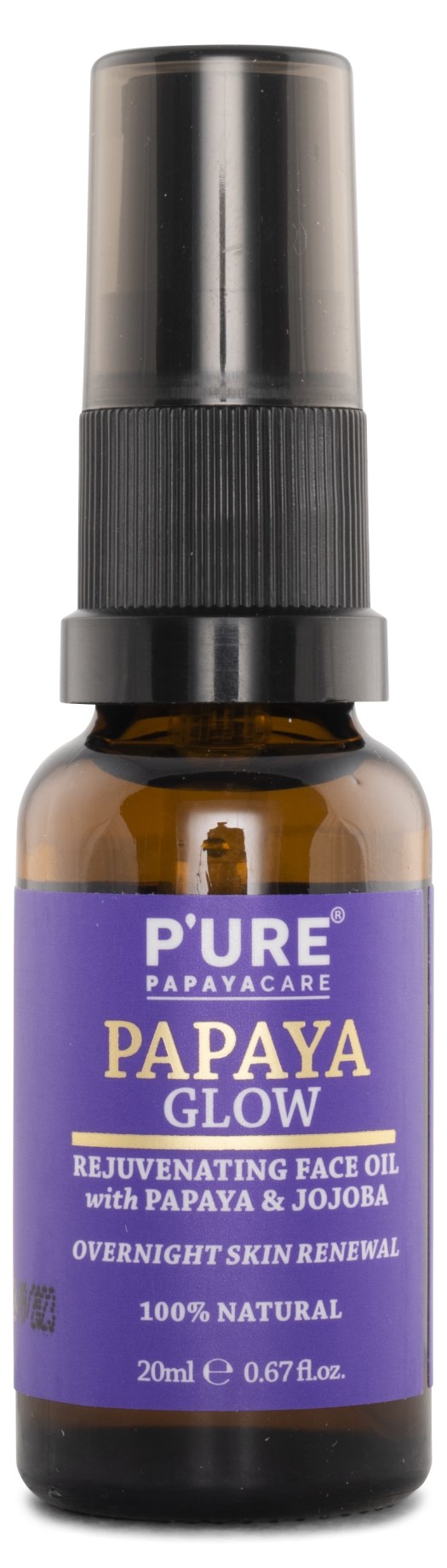 PurePapayacare Glow Rejuvenating Face Oil föryngrar din hud medan du sover. Oljan har en härlig blandning av jojobaolja och papayaolja. Jojobaolja är mjukgörande och återfuktar huden medan papayaolja är naturligt rik på enzymer, omega-fettsyror och vitaminer. Oljan ger din hud en fin lyster och ett vackert glow!