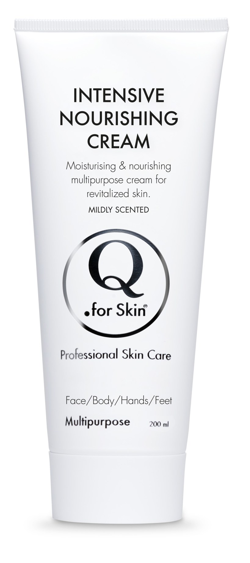 Q for Skin Intensive Nourishing Cream är en återfuktande kräm som går att använda både på kroppen och i ansiktet. Krämen ger en intensiv återfuktning samtidigt som den vitaliserar huden och ger den lyster. Med svartvinbärsfröolja, vitamin B5 och extrakt från probiotiska bakterier. Intensive Nourishing Cream har en mild och naturlig doft och gör huden sammetslen.