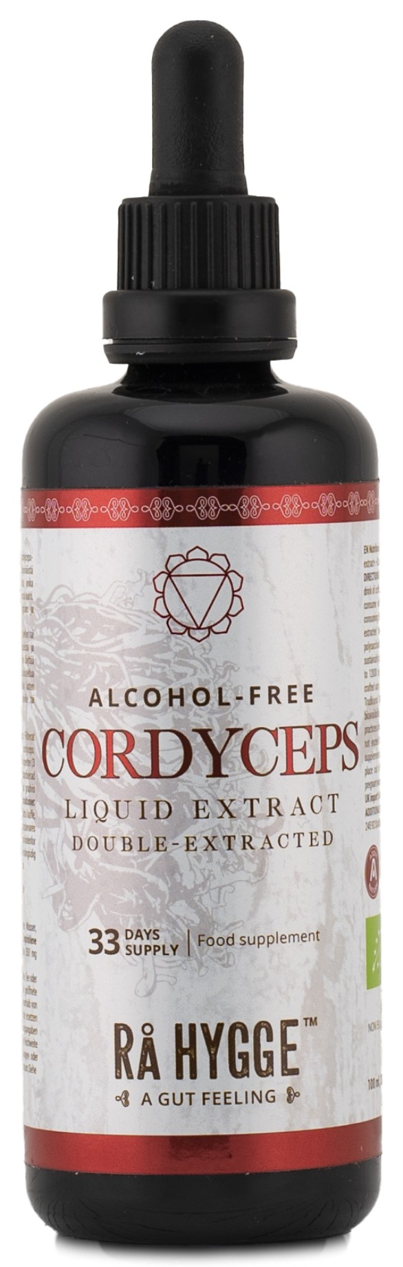 Rå Hygge Flytande Cordyceps Svampextrakt Alkoholfri är ett flytande tillskott med svampextrakt av cordyceps helt utan alkohol. Cordyceps har en lång historia av användning inom traditionell kinesisk medicin, där den tros kunna stödja energi, uthållighet och återhämtning samt ge en adaptogen effekt, vilket balanserar kroppen på naturlig väg. Extraktet är skonsamt tillverkat med en vattenbaserad metod, vilket bevarar svampens bioaktiva ämnen såsom polysackarider och cordycepin.