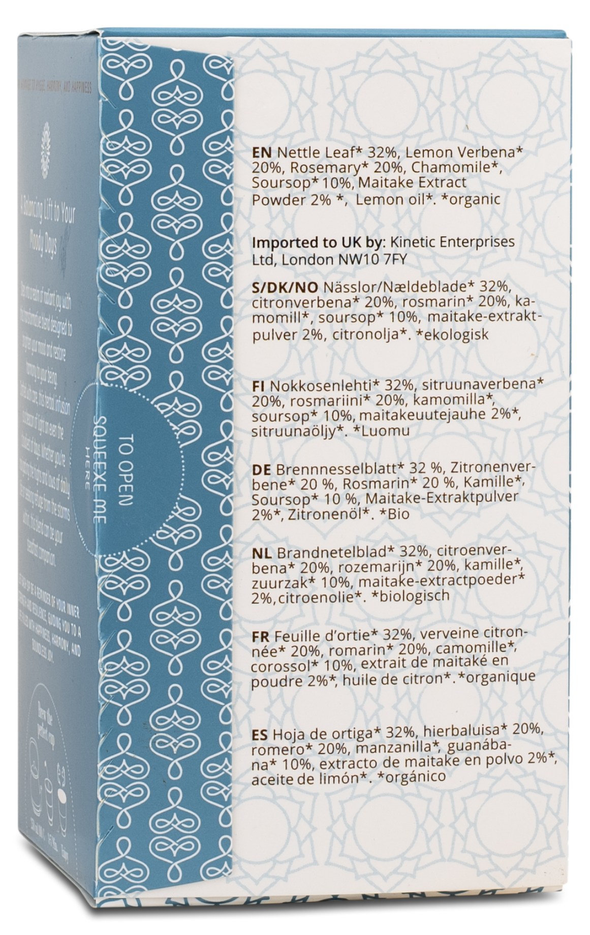 Upplev en mild och upplyftande stund för alla dina sinnen med denna noggrant utvalda blandning av bland annat nässla, kamomill och maitake, skapad för att förbättra ditt humör och ge en känsla av lugn. Teet är varsamt tillverkat för att ge en skön stund även på de tyngre dagarna. Oavsett om du vill hantera vardagens påfrestningar eller söker lite inre ro kan Herbal Te Moody Blues Maitake vara ett stöd. Smaken är jordig och blommig med citrusaktiga toner vilket ger en uppfriskande känsla.