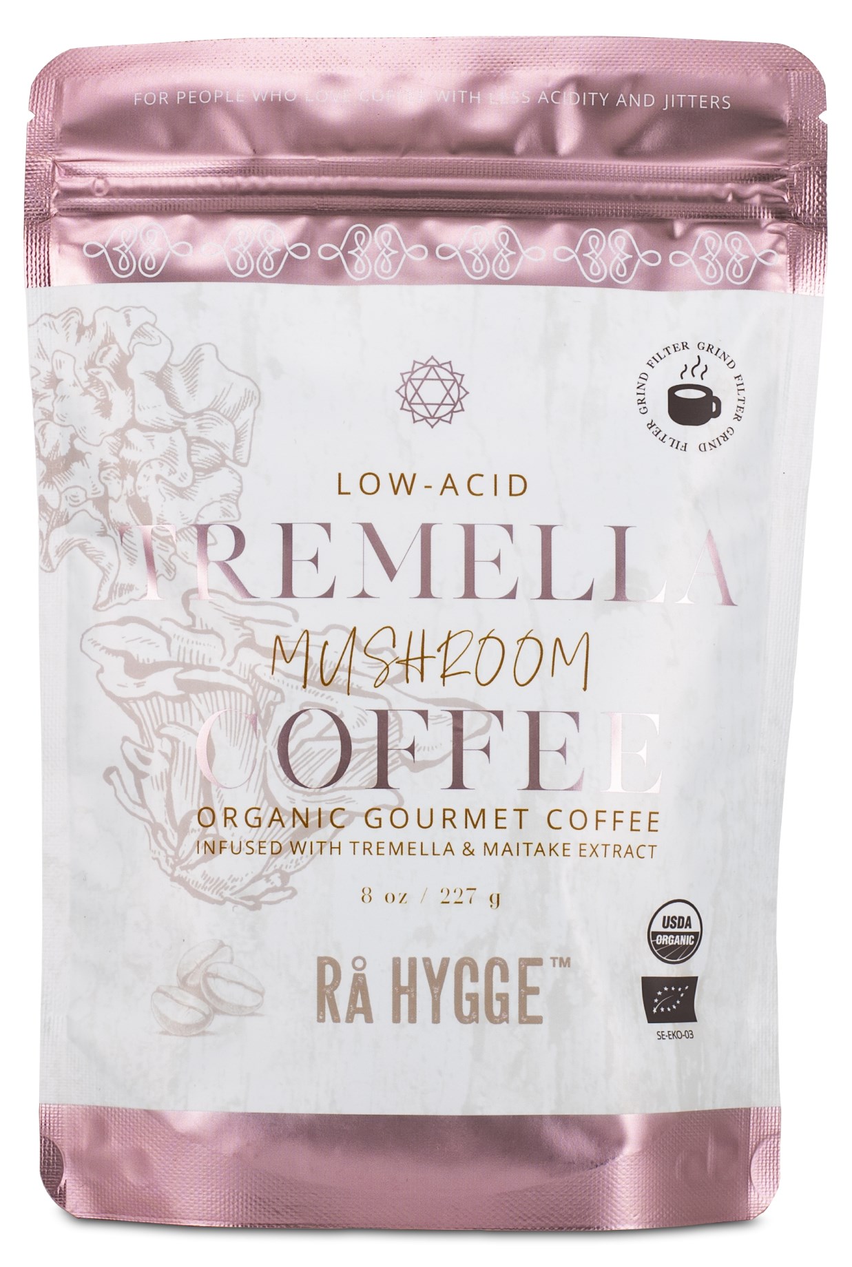 Rå Hygge Tremella & Maitake Svampkaffe är ett fylligt ekologiskt kaffe, framställt med mörkrostade peruanska Arabica-bönor. Det är berikat med extrakt av tremella och maitake-svampar för en ultimat skönhetsblandning. Inom traditionell kinesisk medicin är tremella känd som “skönhetssvampen”, och här kombineras den med maitake-extrakt för att skapa en unik och njutbar smakprofil. Dessa funktionella svampar bidrar inte bara till att sänka syranivån, utan tillför även andra hälsofrämjande egenskaper. Tack vare en syranivå så låg som pH 6,0, i jämförelse med vanligt kaffe som ligger mellan 4,0 och 6,0, är detta kaffe skonsamt för magen. Kaffebönorna kommer från småskaliga bönder i Peru och är rostade på hantverksrosteri i Sverige. Svampkaffet finns tillgängligt som hela bönor eller bryggkaffe och passar utmärkt både för nybryggt filterkaffe och espresso. Njut av drycken två gånger om dagen för en bestående känsla av energi.