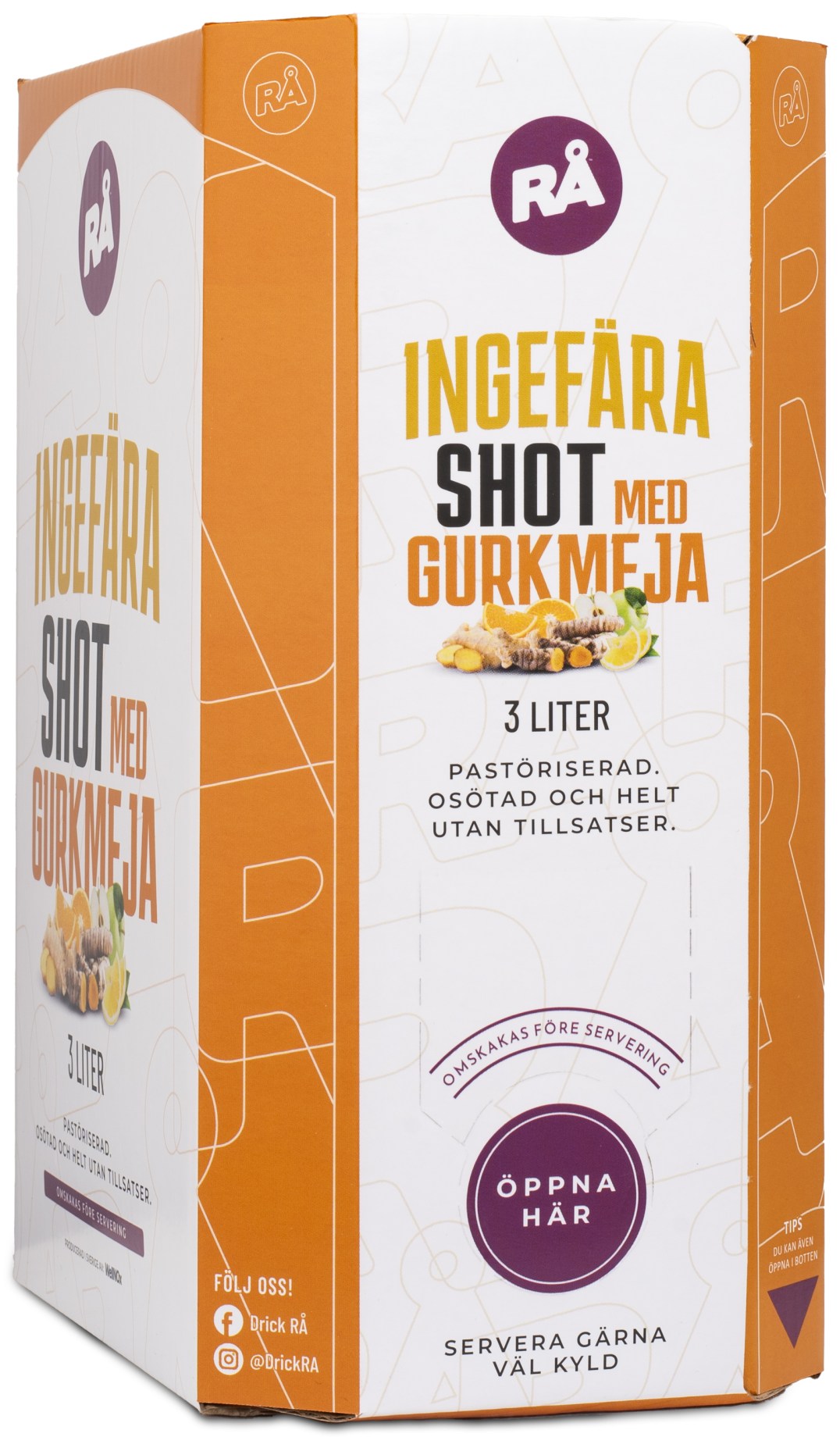 RÅ Ingefärashot m Gurkmeja Bag-in-Box är en kryddig hälsoshot med rivig ingefära och gurkmeja. Tillsammans med toner från frisk apelsin, saftigt äpple och en pigg touch av citron får juicen en fyllig smak med sting och fräschör. Den kraftfulla, friska och balanserade smaken gör sig perfekt som en shot.