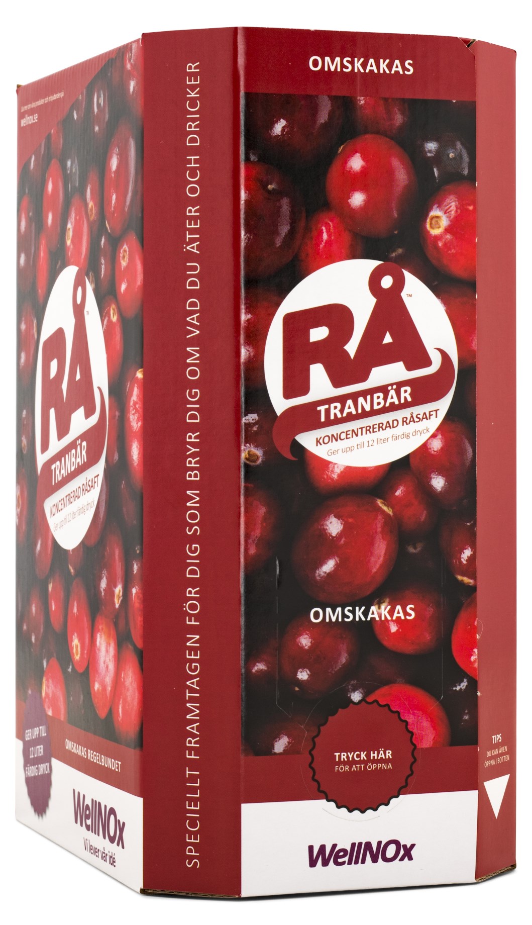 RÅ Tranbär innehåller 100 % osötat tranbärskoncentrat och är helt fri konserveringsmedel och andra tillsatser. Späd 1:4 eller 1:8 som en god och hälsosam måltidsdryck eller drick den som den är. Tack vare den tätslutande förpackningen håller sig den praktiska bag-in-boxen fräsch i minst en månad efter öppning. Observera att smaken kan variera något mellan olika säsonger.