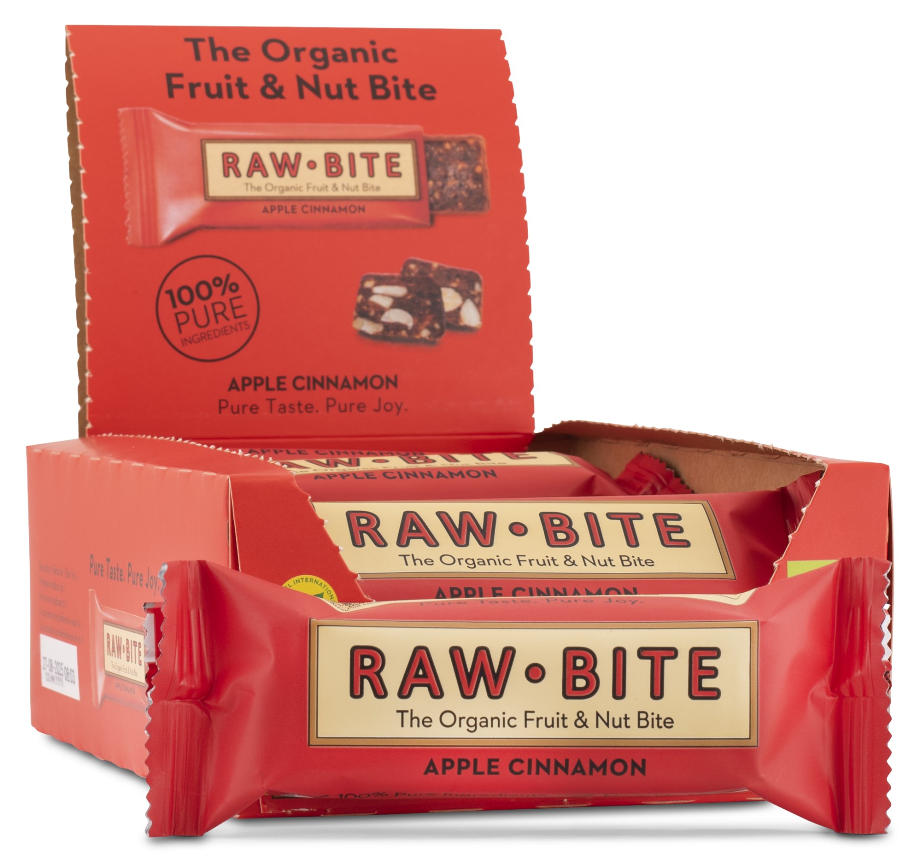 RAWBITE med smak av äpple och kanel tillverkas av 100% naturliga och ekologiska ingredienser. Det är en frukt och nötbar som är helt fri från mjölk, gluten, ägg, soja, tillsatt socker och konstgjorda smak- och färgämnen. Det är helt enkelt en nyttig bar som passar utmärkt att ha med sig i väskan eller på fikat!