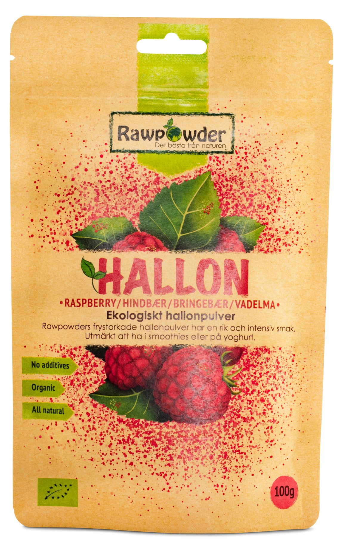 Hallonpulver EKO från RawPowder är ett smakrikt frystorkat pulver av ekologiska hallon. Hallonen kommer från Polen, men dess smak och näringsinnehåll är det samma som hos de svenska bären. Hallon är en riktig närings- och antioxidantbomb som smakar ljuvligt i exempelvis mjölk, yoghurt eller som tillbehör till glassen.