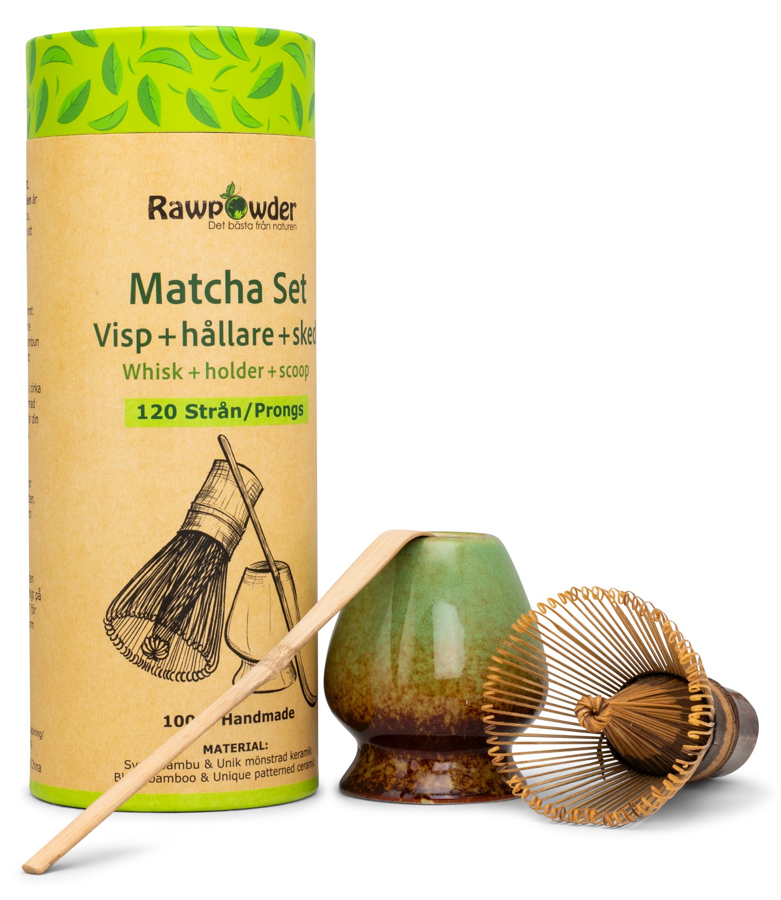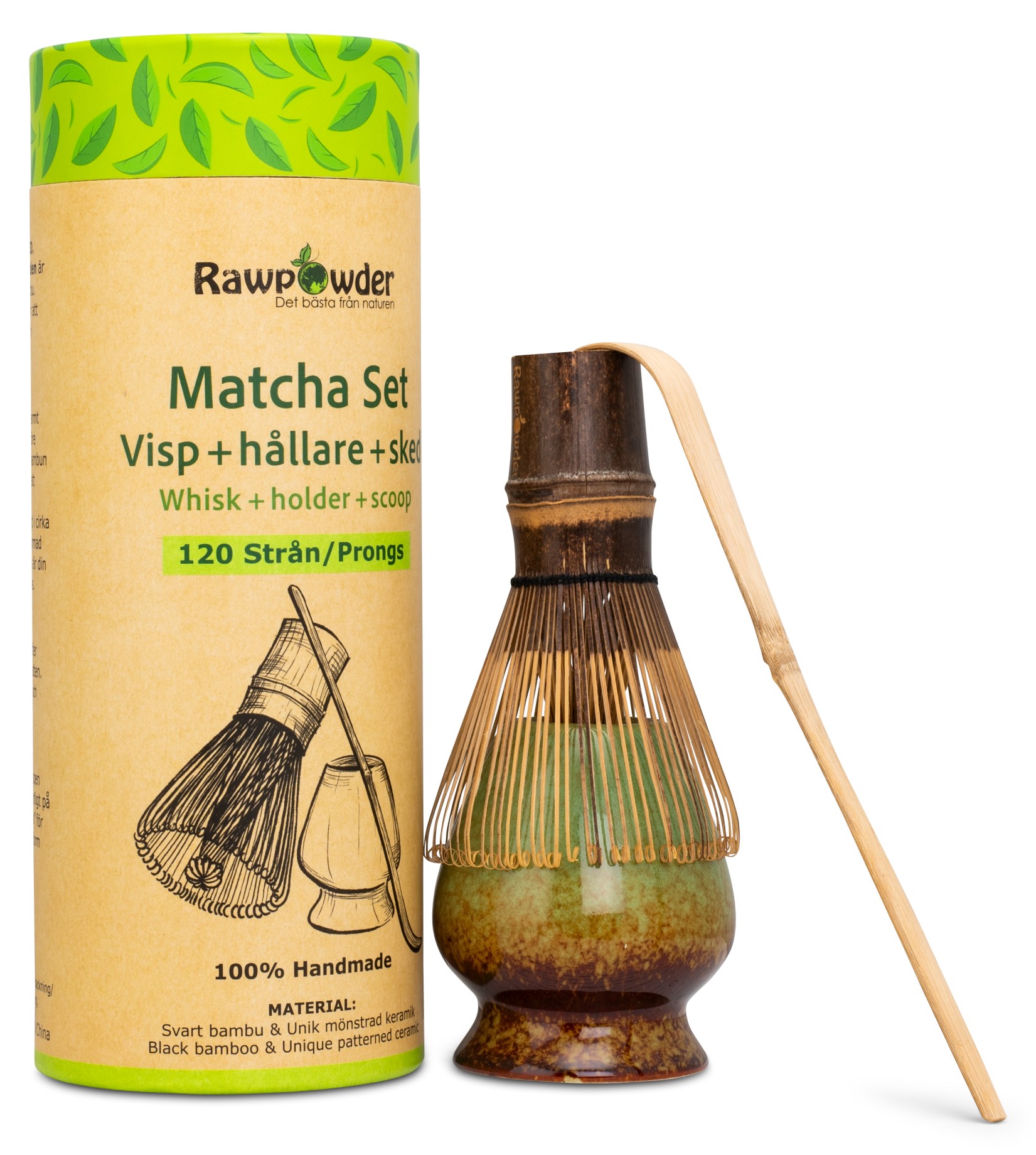 RawPowder Matcha Set är ett set för både matcha-älskaren och för dig som vill dricka matcha för första gången. Matchasetet består av matchasked, visp och visphållare. Vispen har extra många strån – hela 120 stycken – vilket ger ett lent och fint skum, och ger en lyxig matchaupplevelse. Både visp och sked är tillverkade i svart bambu. Den vackra visphållaren är tillverkad i mönstrad keramik och ser till att vispen håller formen, samt förebygger mögel och skador.