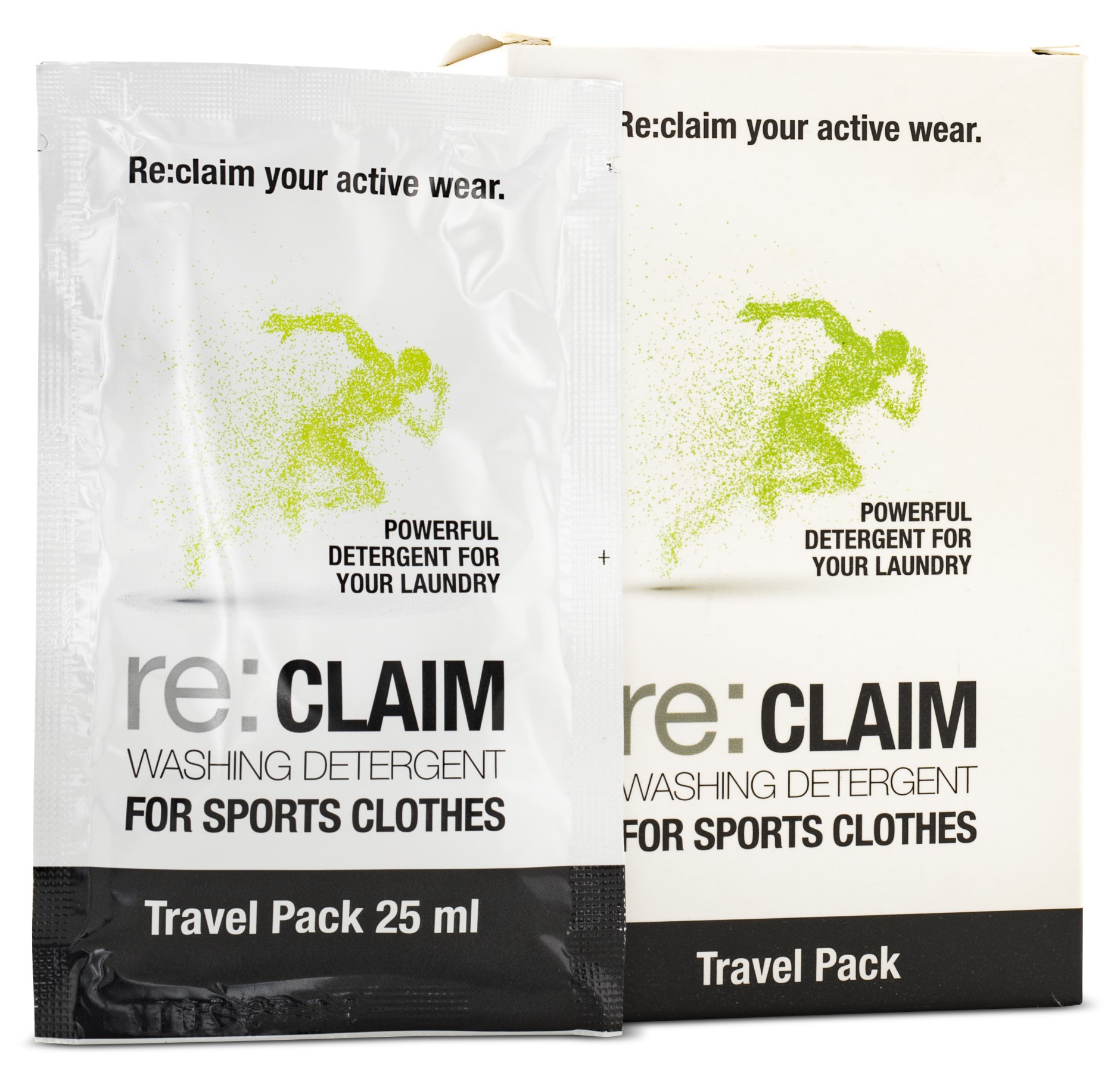 Re:claim Travel Pack innehåller Washing Detergent i smidiga reseförpackningar. En förpackning innehåller 7 påsar, där en påse är lagom för en tvätt. Detta tvättmedel är speciellt för träningskläder, och eliminerar dålig svettlukt på ett effektivt sätt. Tvättmedlet innehåller enzymer som bryter ned doftmolekyler och kläderna doftar härligt fräscht efteråt.