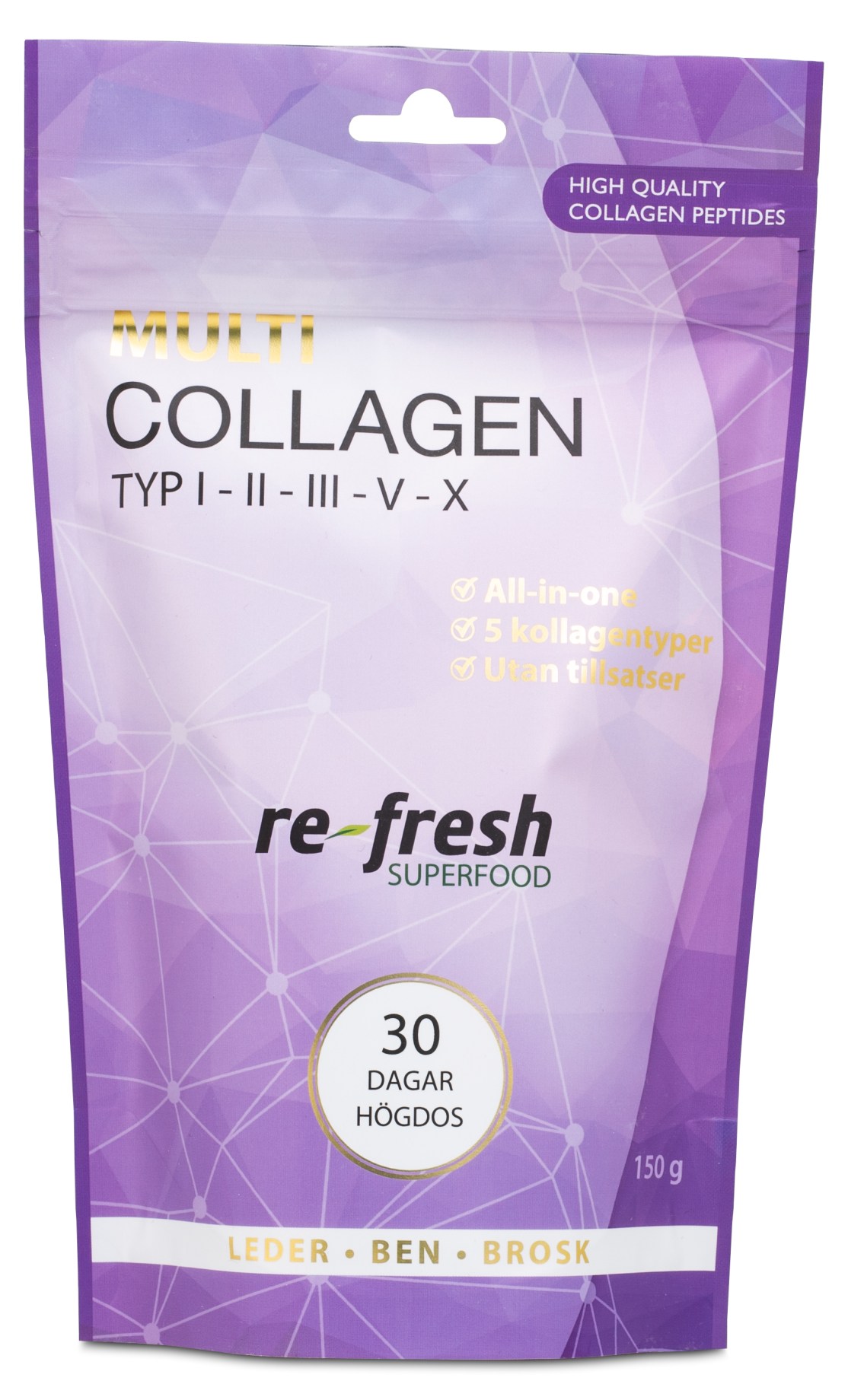 Re-fresh Superfood MultiCollagen är ett tillskott av fem kollagentyper, de fyra vanliga uppbyggande kollagentyperna 1, 2, 3 och 5 samt den nybyggande typ 10. MultiCollagen är en ren produkt som ger en hög dos kollagen med ett råvaruinnehåll från gräsbetande bovint, vit matfisk, äggskalsmembran och Avian Sternum (kyckling), allt från ett miljövänligt tillvaratagande av livsmedelstillverkarnas biprodukter. I takt med att åldern ökar så minskar kollagenet, med MultiCollagen får leder, brosk och hud hjälp att återställa och bibehålla sina funktioner. Kollagenet är smak- och doftfritt och löser sig enkelt i vatten.