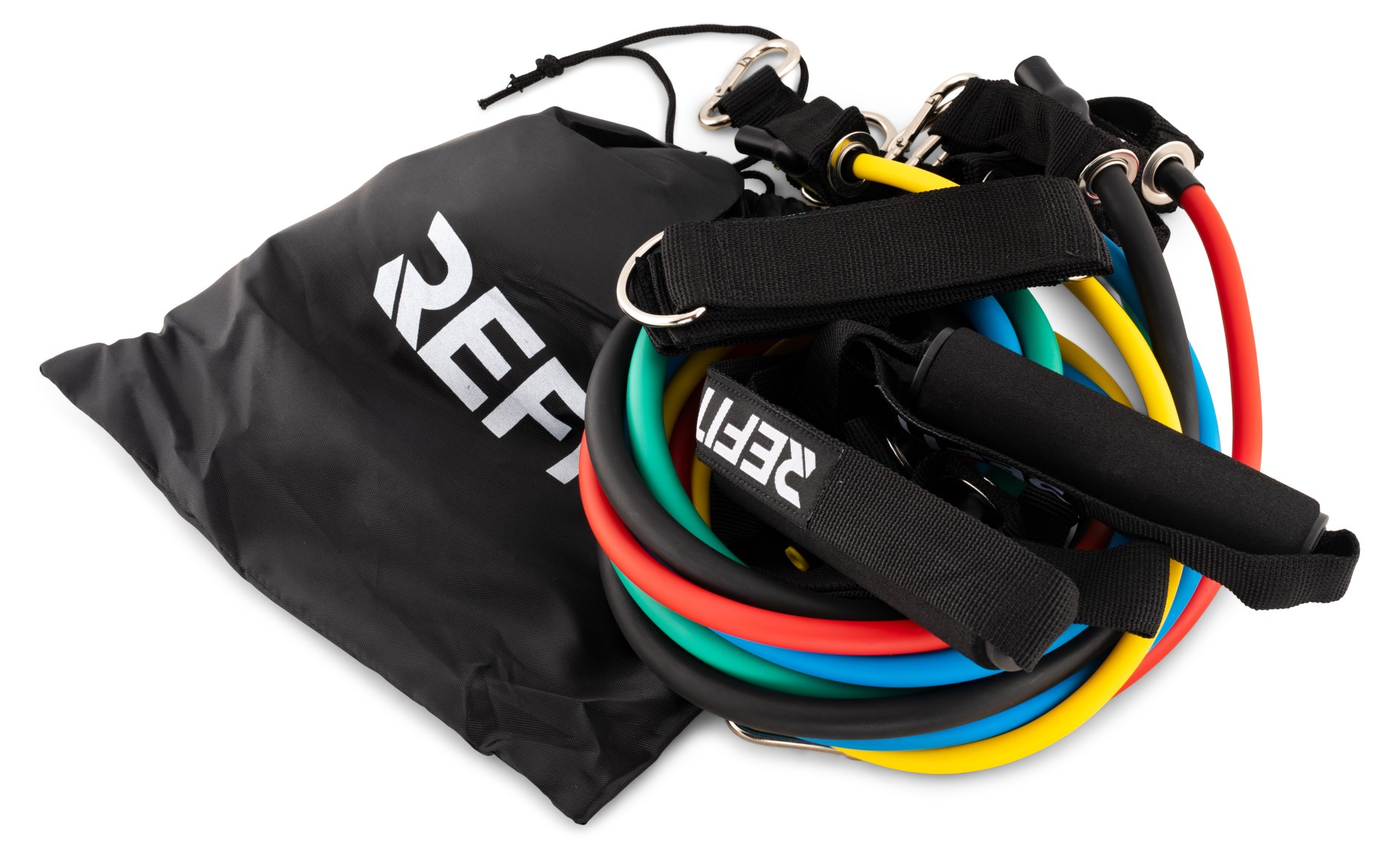 Refit Basic Tube Multiset är ett träningsredskap för hela kroppen. Du kan effektivt träna ben, bröst, rygg, axlar och armar. Basic Tube Multiset innehåller 5 exertubes med karbinhake i 5 olika motstånd samt 2 handtag, 2 ankelfästen och ett dörrfäste som du kan använda i flera olika variationer. Enkel att förvara och enkel att ta med sig i den medföljande påsen. Träna igenom hela kroppen utan att behöva åka hemifrån!