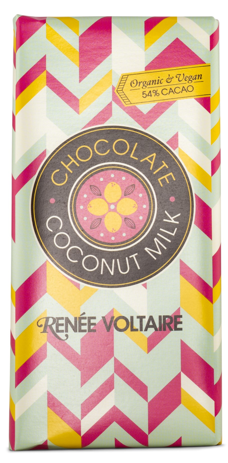 Renee Voltaire Chokladkaka med Kokosmjölk Eko är en ekologisk och vegansk chokladkaka. Chokladen har en 54 % kakaohalt, är sötad med kokossocker och innehåller finkrossade kokosflingor. Perfekt när du är sugen på något gott och vill undvika mjölk!