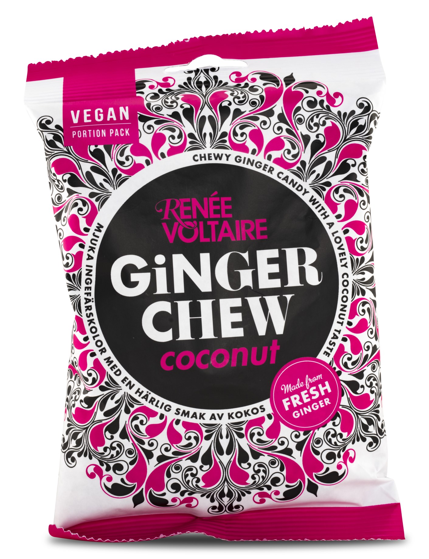 Förgyll fredagsmyset med Renée Voltaire Ginger Chew, veganska och glutenfria ingefärskolor. Helt utan onödiga syntetiska tillsatser och färgämnen! Med färsk ingefära samt tapiokastärkelse från kassavarot för att inte klibba. Utforska de spännande smakerna - vad sägs till exempel om frisk mango eller syrlig granatäpple? Kanske ljuvlig kokos eller smarrig jordnöt? Renée Voltaire Ginger Chew - en ingefärskola med söt och kryddig smak i härlig kombination!