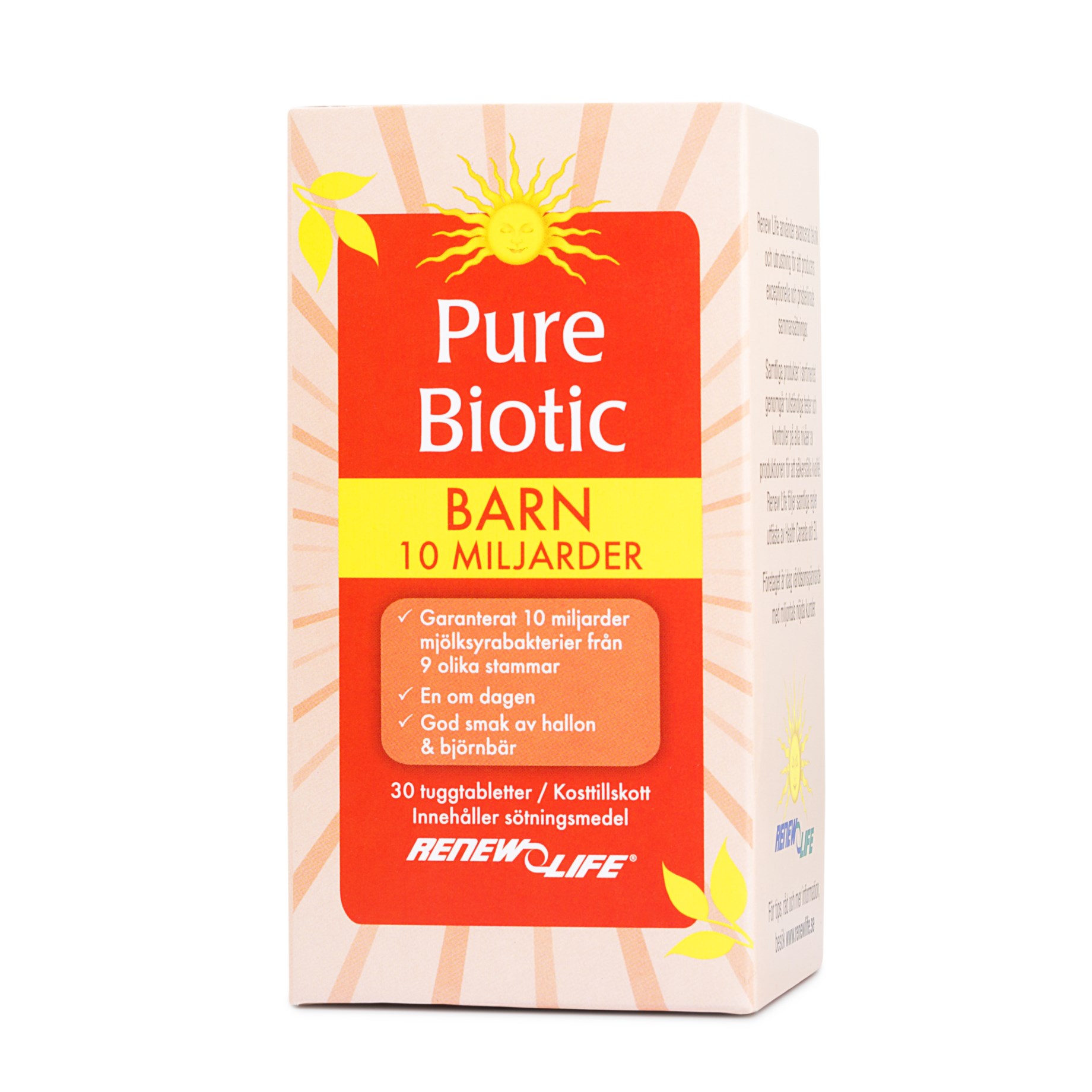 Pure Biotic Barn från Renew Life innehåller hela 10 miljarder mjölksyrabakterier som gör gott för barnets mage och tarmar och hjälper dem att fungera normalt. Dessa tuggtabletter innehåller bakterier från 9 stammar vilket ger ett brett spektrum av olika bakterier i en hög koncentration. Tabletterna är fria från tillsatser och syntetiska medel och har fått en god, naturlig smaksättning av björnbär och hallon. De många bakterierna bidrar till en hälsosam tarmflora vilket i sin tur är positivt för en allmän mag- och tarmhälsa.