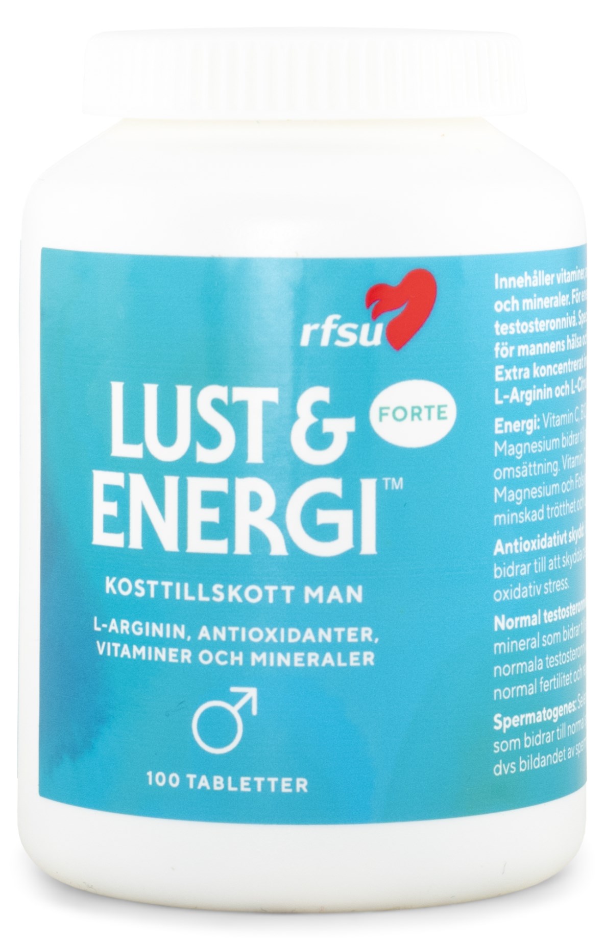 Lust och Energi Man från RFSU är speciellt framtaget för att möta mannens behov av vitaminer och mineraler. Lust och Energi Forte för män har ett noga utvalt innehåll som zink och selen för att bidra till att bibehålla normala testosteronnivåer i blodet, fertilitet, reproduktion samt bildandet av spermier. Magnesium, vitamin C, B12, B6 och folsyra bidrar till normal energiomsättning, minskad trötthet och skydd mot oxidativ stress. Du finner även ett extra koncentrerat innehåll av aminosyrorna L-citrullin och L-arginin som bidrar till ökat blodflöde, prestation och uthållighet.