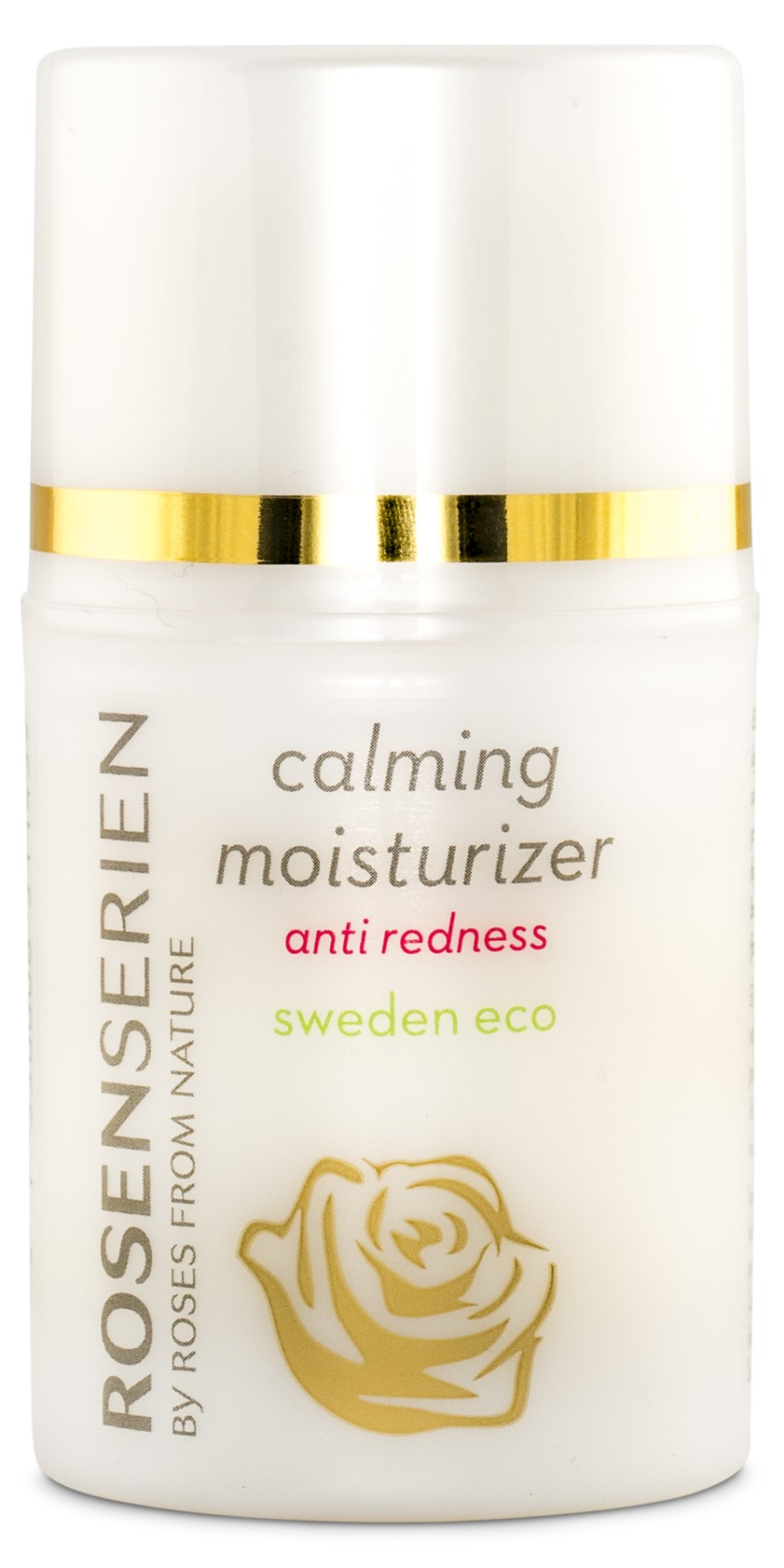 Rosenserien Calming Moisturizer Anti Redness är en återfuktande ansiktskräm för röd och/eller känslig hy. Kan användas vid exempelvis ytliga blodkärl, kronisk rödhet, rosacea och akne. Krämen innehåller prebiotika och fermenterade mineraler som hjälper till att dämpa rodnaden och öka hudens fasthet. Passar för känslig hud men kan användas på alla hudtyper.