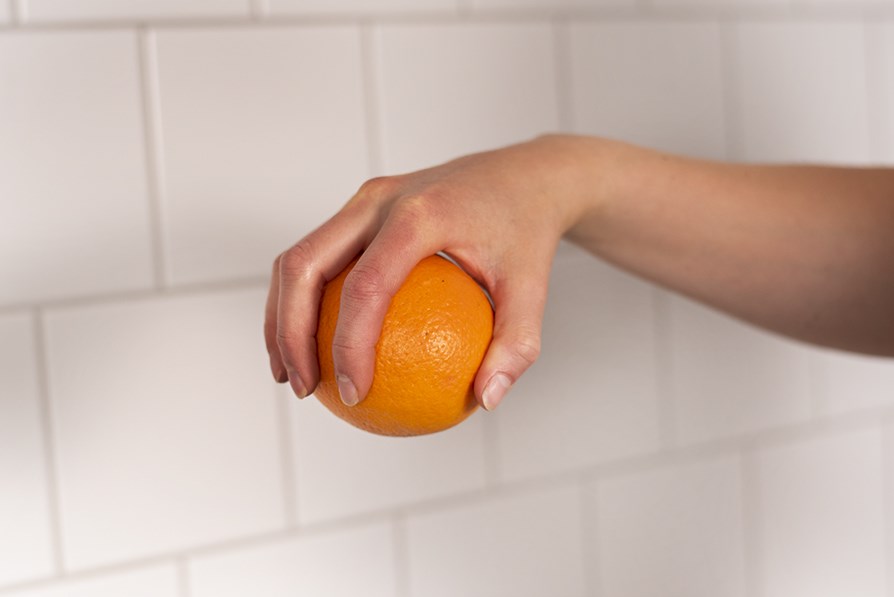 - Låtsas att du håller i en apelsin med den handen du ska spraya på.