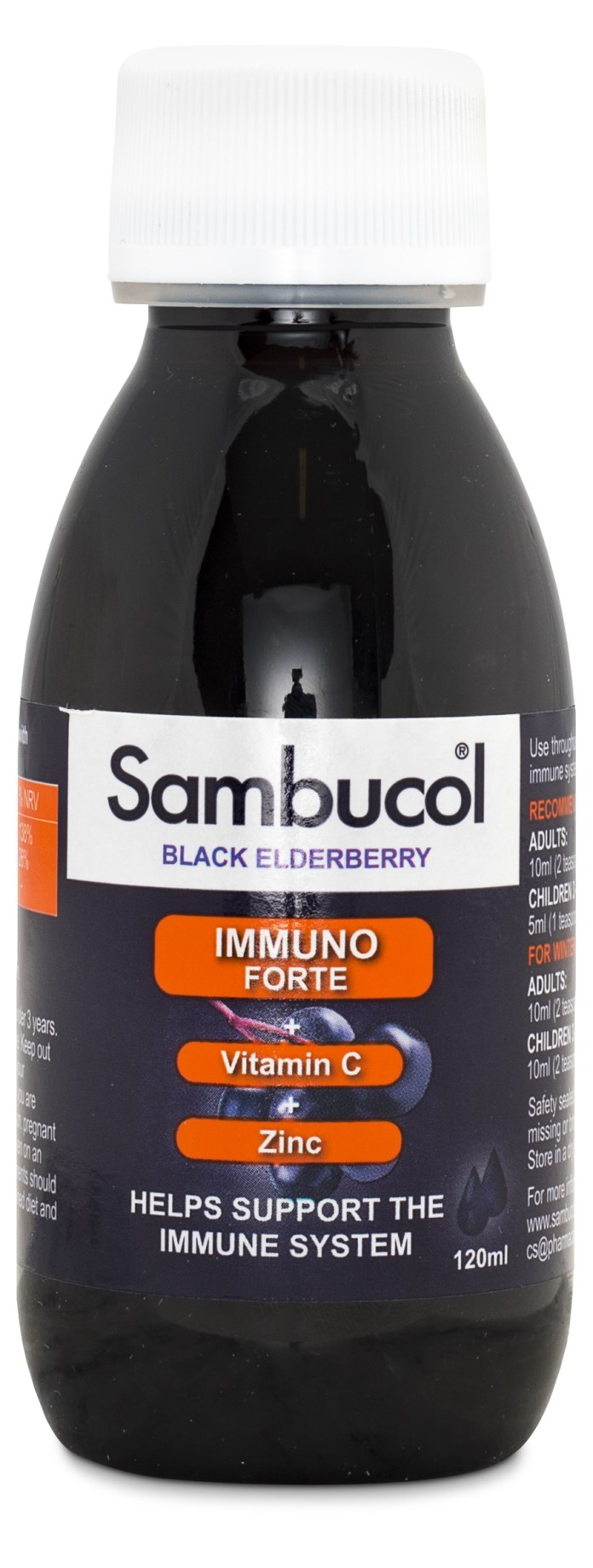 Sambucol Immuno Forte 120 ml är ett flytande kosttillskott med svart fläderbärsextrakt, vitamin C och zink. Denna kan användas till vuxna och barn över 3 år.