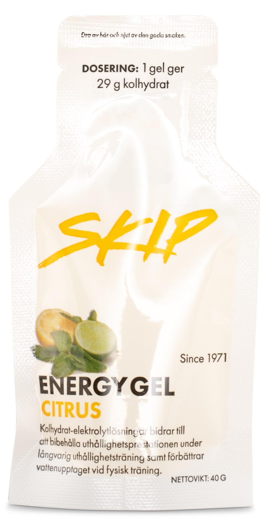 Vill du ha en energigel utan koffein, väljer du Skip Energy Gel i smaken HallonBreeze. Vill du ha en energigel med koffein, väljer du smaken Cola med koffein.