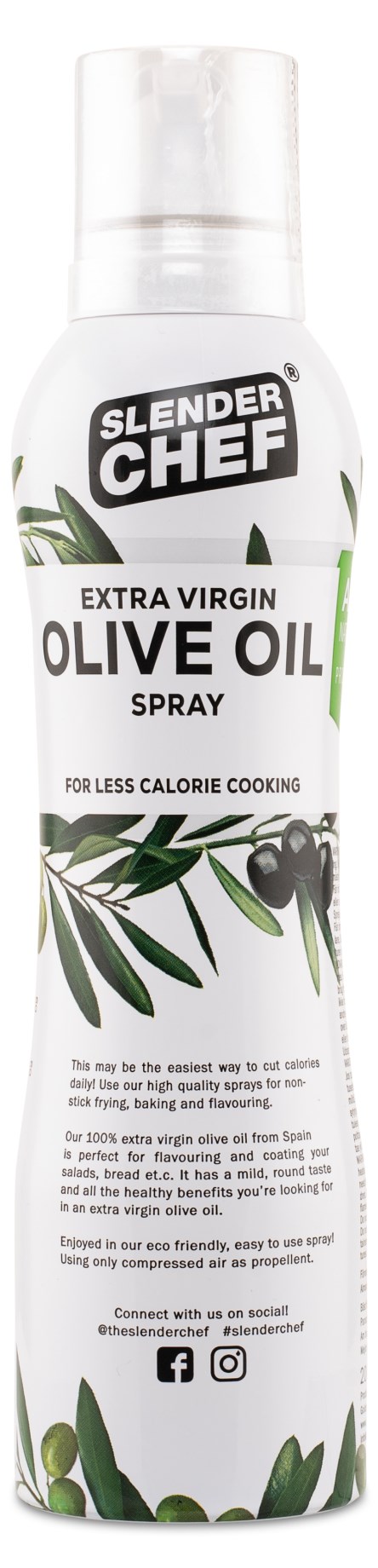 Slender Chef Extra Virgin Olive Oil Spray är en praktisk olivolja i sprayform som hjälper dig att minska fettanvändningen vid matlagning. Med endast 1 g fett per spray jämnt fördelar den sig även på större ytor, tack vare dess trycksatta förpackning. Perfekt för stekpannan eller för direkt applicering på maten, som att rosta potatis i ugnen.