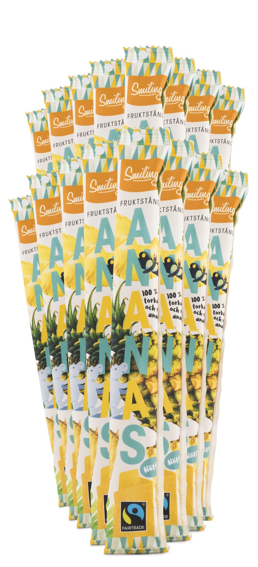 Smiling Fruktstång 100% är en fruktstång med söt frukt från Ghana. Mangon och ananasen är Fairtrade-certifierade. Perfekt som snack eller mellanmål när energin är låg. En perfekt humörhöjare till alla i familjen, stora som små, när energin är låg eller om man bara vill ha något gott!