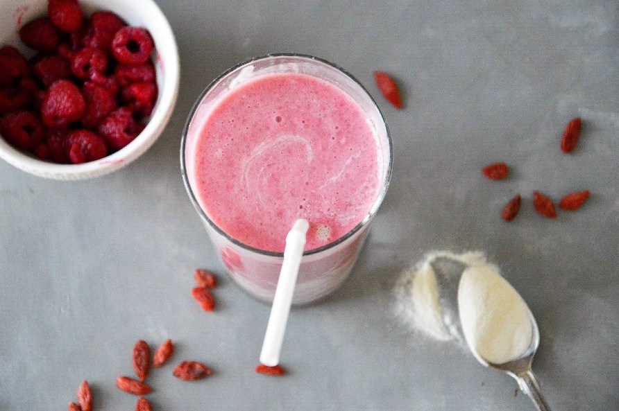 Smoothie med protein och kollagen, perfekt som en mättande frukost på språng!