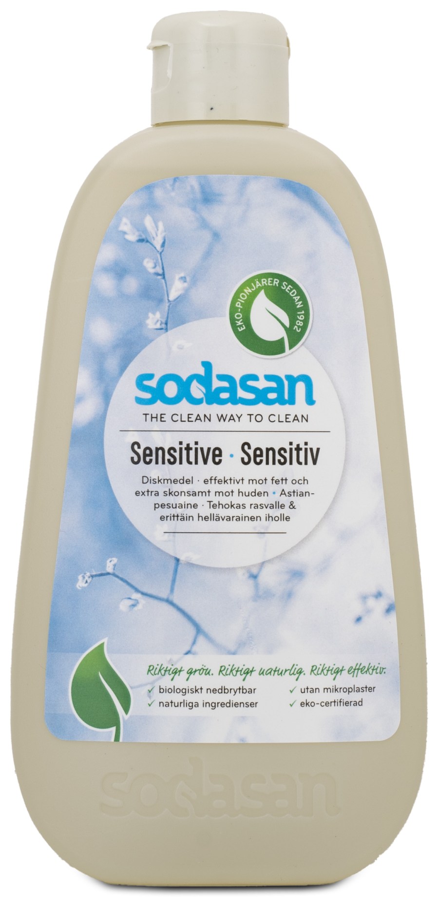 Sodasan Diskmedel Sensitive är fri från doft, färg och konserveringsämnen för dig med känslig hud.