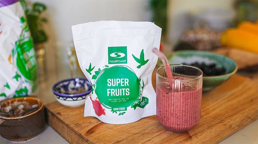 Testa Sofia Ståhls energismoothie med Healthwell Super fruits! Proppfull med näringsrika bär och frukter. Perfekt när du behöver lite extra energi eller som en god frukostsmoothie.