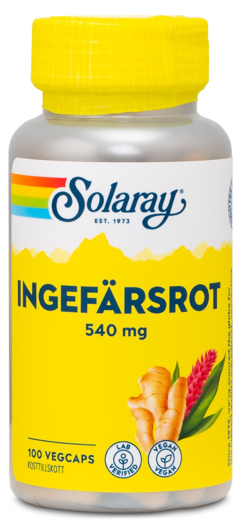 Solaray Ingefärsrot är veganska kapslar med ingefära, med 540 mg hel ingefära per kapsel. Ingefärsrot innehåller naturligt förekommande eteriska oljor, såsom gingeroler och shogaoler. Gingeroler är ett särskilt intressant ämne och en av anledningarna till att ingefära använts i mat och dryck i olika kulturer världen över. Ingefärans rika näringsinnehåll gör den även populär inom olika huskurer.
