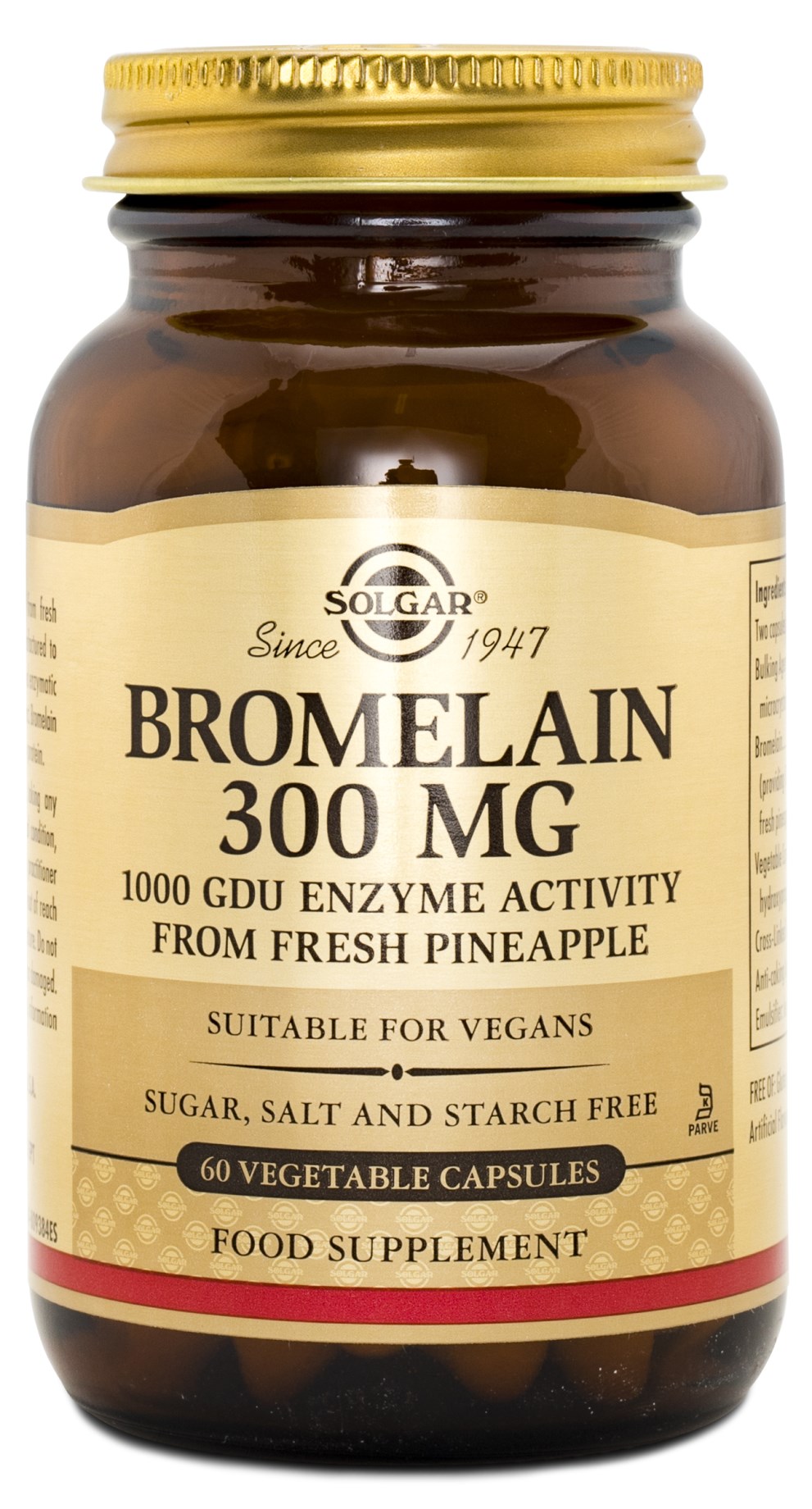 Solgar Bromelain 300 mg innehåller det proteinnedbrytande enzymet bromelain, även kallat bromelin. Detta enzym utvinns ur ananas och är bland annat orsaken till att vissa personer kan uppleva en kliande känsla i munnen vid förtäring av ananas. Solgar Bromelain 300 mg används i samband med pollenallergi från exempelvis gräs- eller björkpollen. Det kan till exempel handla om svullnad i slemhinnorna, framför allt i näsa och bihålor. Använd Solgar Bromelain 300 mg mellan måltider för att optimera dess effekt. Om du istället vill använda bromelain för att hjälpa till att spjälka maten ska du ta kapslarna i samband med måltid.