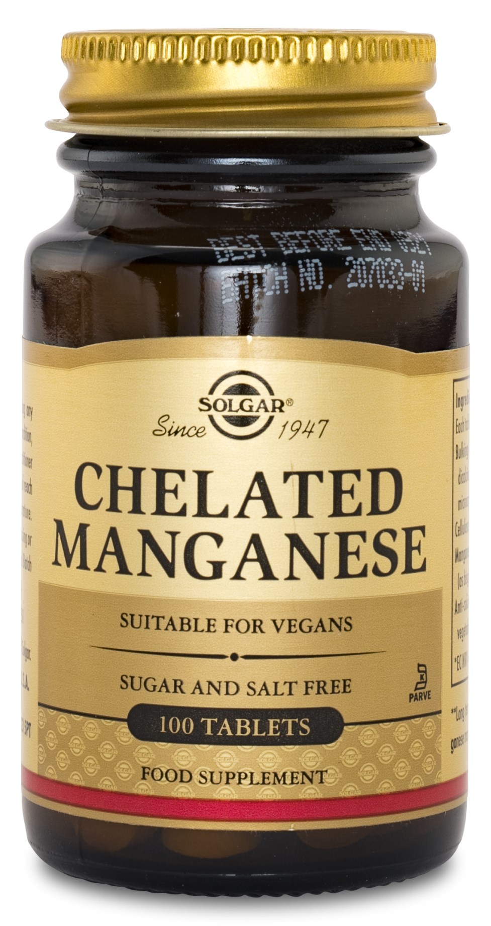 Mangan är ett mineral som förekommer naturligt i berggrunden och det är ännu inte fastställt om mangan är ett essentiellt ämne för människan. Som näringsämne deltar mangan i kroppens omsättning av kolhydrater och protein. Solgars mangan är kelaterad vilket innebär att metallen neutraliserats så att kroppen ska kunna tillgodogöra sig den. Mangan återfinns främst i livsmedel som fullkornsprodukter, ris och bär.