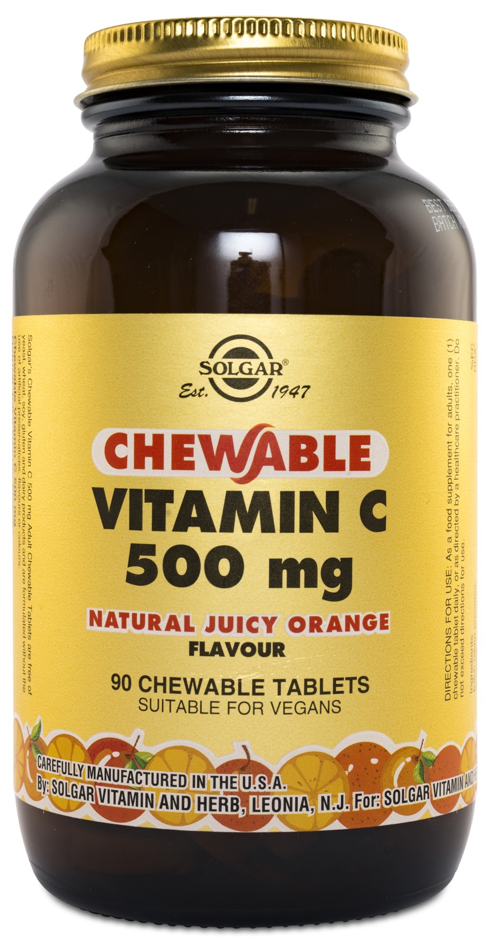 Solgar Chewable Vitamin C är C-vitamin i tuggtabletter, ett gott och smidigt sätt att säkerställa dagsbehovet av vitamin C. En tuggtablett innehåller 500 milligram C-vitamin, och smakar gott av fruktiga aromer. Dessutom är naturliga fruktextrakt från acerola och nypon tillsatt, två bär som är rika på C-vitamin i naturen.