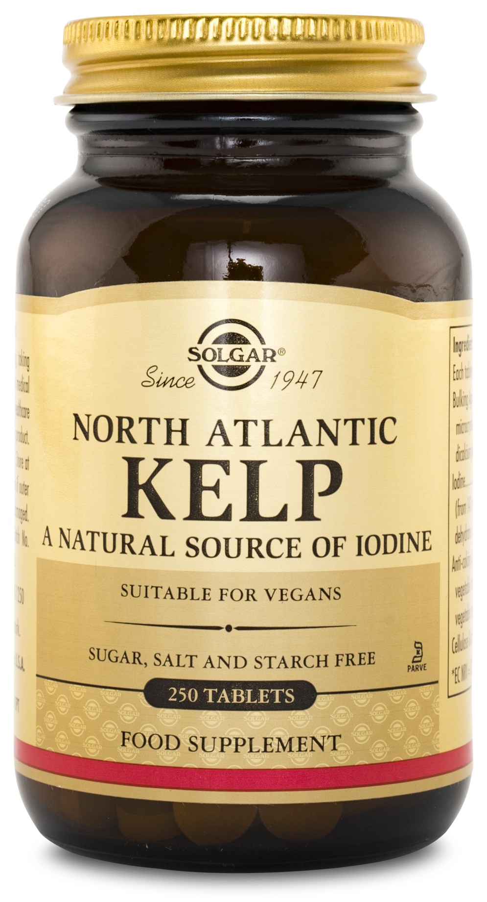 Solgar® Kelp är ett kosttillskott med jod och innehåller kelp från Nordatlanten. Solgar® Kelp är helt fritt från gluten, vete, soja, mejeri, jäst, socker, artificiella färgämnen och smaksättning. Kelp är en naturlig källa till jod, som har en central roll i produktionen av kroppens hormoner och bidrar även till en fungerande ämnesomsättning samt till normala nivåer av sköldkörtelhormoner. Äter du en en vegetarisk kost eller går på diet och äter lite mat kan det vara svårt att få i sig jod. Komplettera då med 1 tablett Solgar® Kelp om dagen i samband med måltid för att försäkra dig om ditt intag.