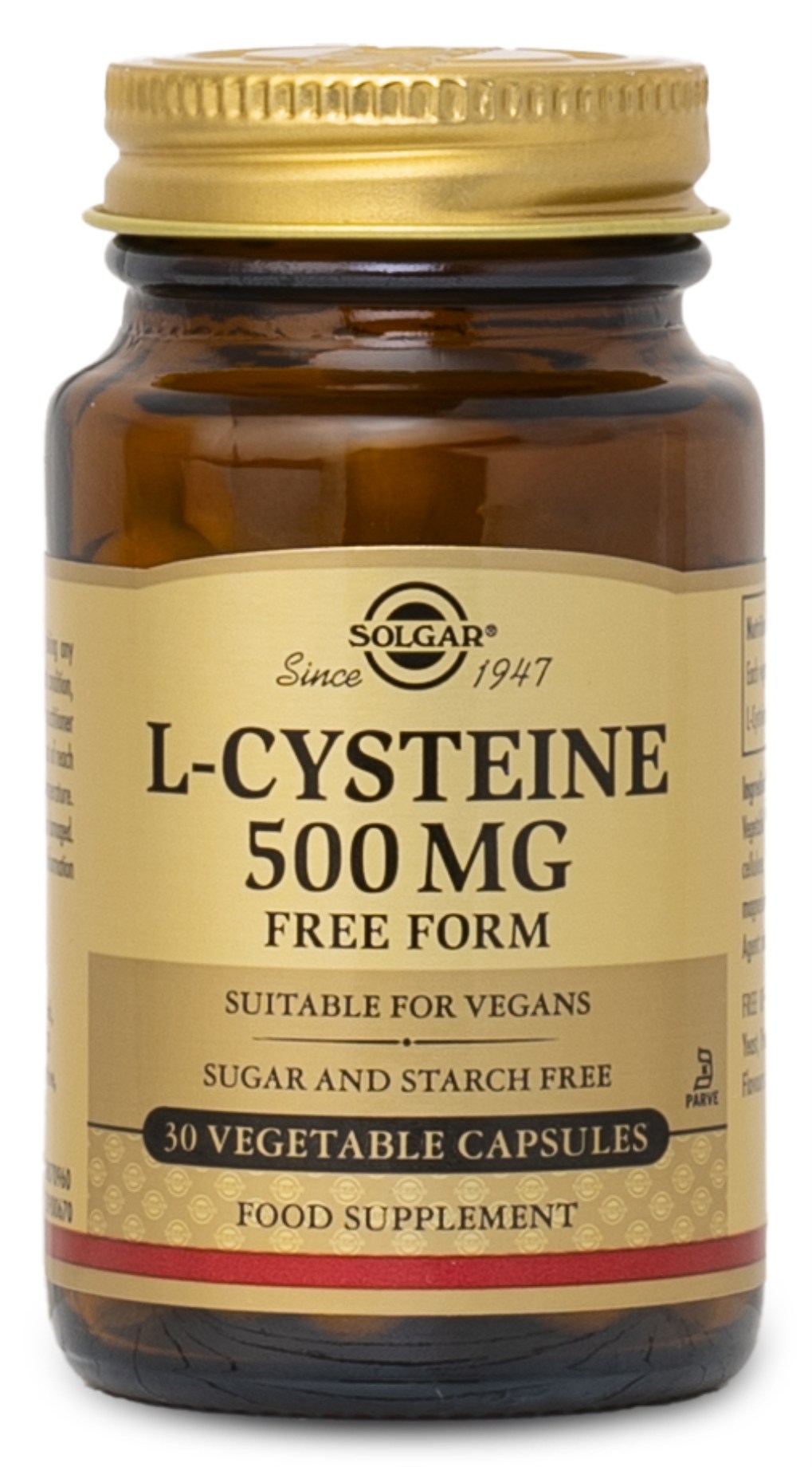 L-cystein är en icke-essentiell aminosyra som medverkar till bildandet av glutation. L-cystein är en svavelhaltig aminosyra och förekommer i huden och i håret. L-cystein finns även i flera andra proteiner i kroppen. Solgar L-cystein innehåller 500 milligram per kapsel, och är ett helt vegetabiliskt tillskott utan jäst, gluten och soja. Ta helst kapseln på tom mage direkt på morgonen med vätska, för bästa upptagningsförmåga.
