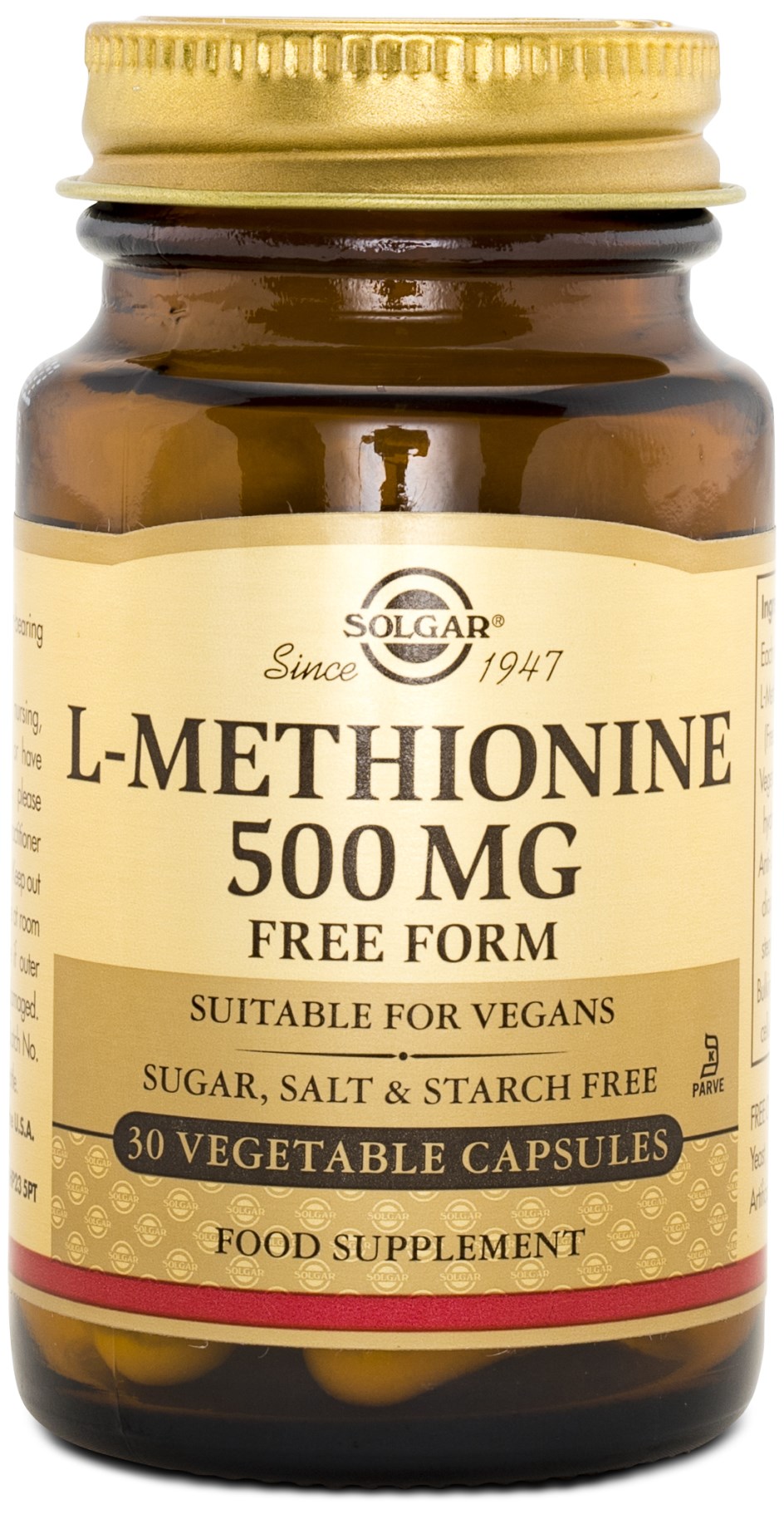 Solgar L-Methionine 500 mg innehåller aminosyran L-metionin i vegetabiliska kapslar. Aminosyror är själva byggstenarna i allt protein och behövs för flera av kroppens funktioner.