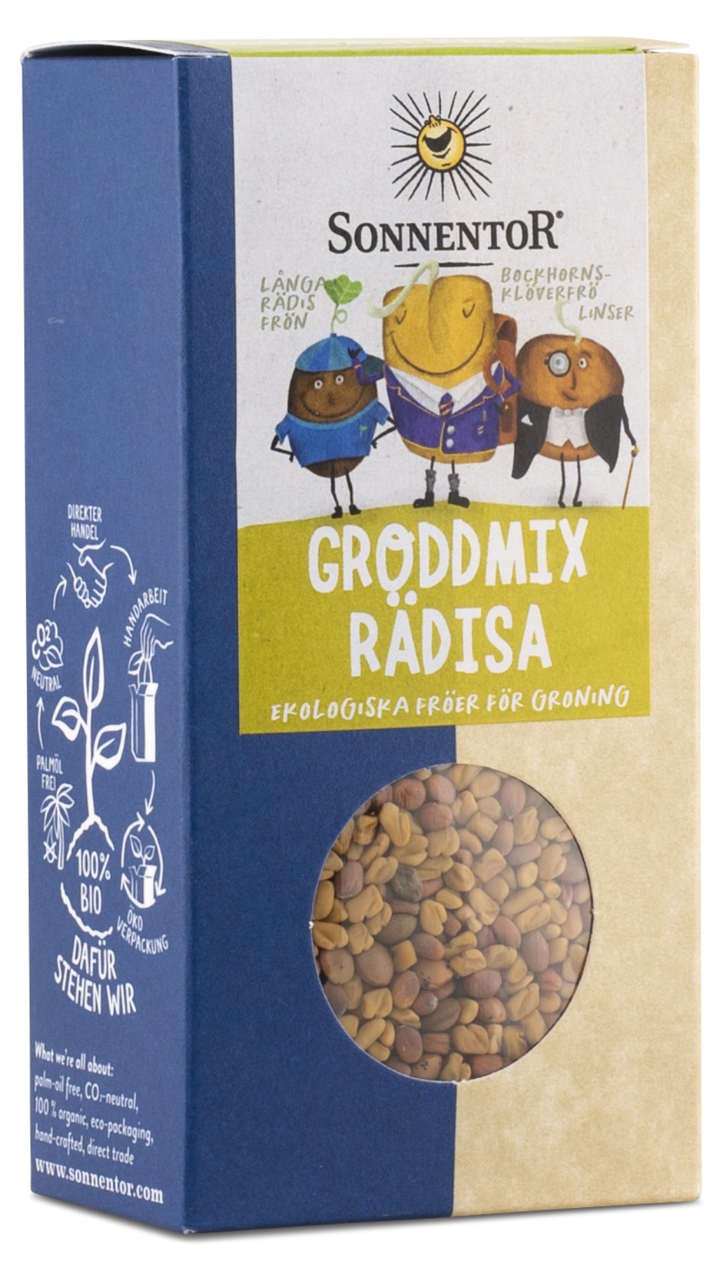 Sonnentor Groddmix Rädisa är en blandning med bockhornsklöverfrön, linser och rädisfrön. Dessa frön groddar du enkelt hemma och kan sedan smaksätta dina maträtter med. Använd groddarna till sallad, soppa och många andra maträtter, det är bara din fantasi som sätter gränser. Blötlägg fröna i 6-8 timmar och skölj dem två gånger om dagen. Efter 4-6 dagar kan du skörda dina groddar.