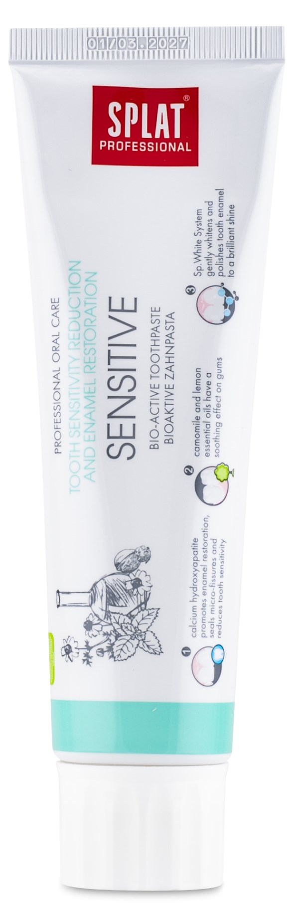 Får du ofta ilningar eller har du hög tandkänslighet? Då kan Splat Tandkräm Sensitive med Hydroxiapatit vara för dig! Denna tandkräm är framtagen för dig som har känsliga tandhalsar och hög tandkänslighet. Den innehåller kalciumhydroxiapatit (HAP), istället för fluor, vilket stärker och remineraliserar tunn emalj för att lindra tandkänslighet. Hydroxiapatit, som naturligt förekommer i saliv och utgör 98 % av tandemaljen, stärker tänderna genom att leverera mikropartiklar som fyller igen små sprickor och håligheter. Tänderna får även en mild tandblekning med hjälp av enzymet pepain som skonsamt avlägsnar plack och missfärgningar.