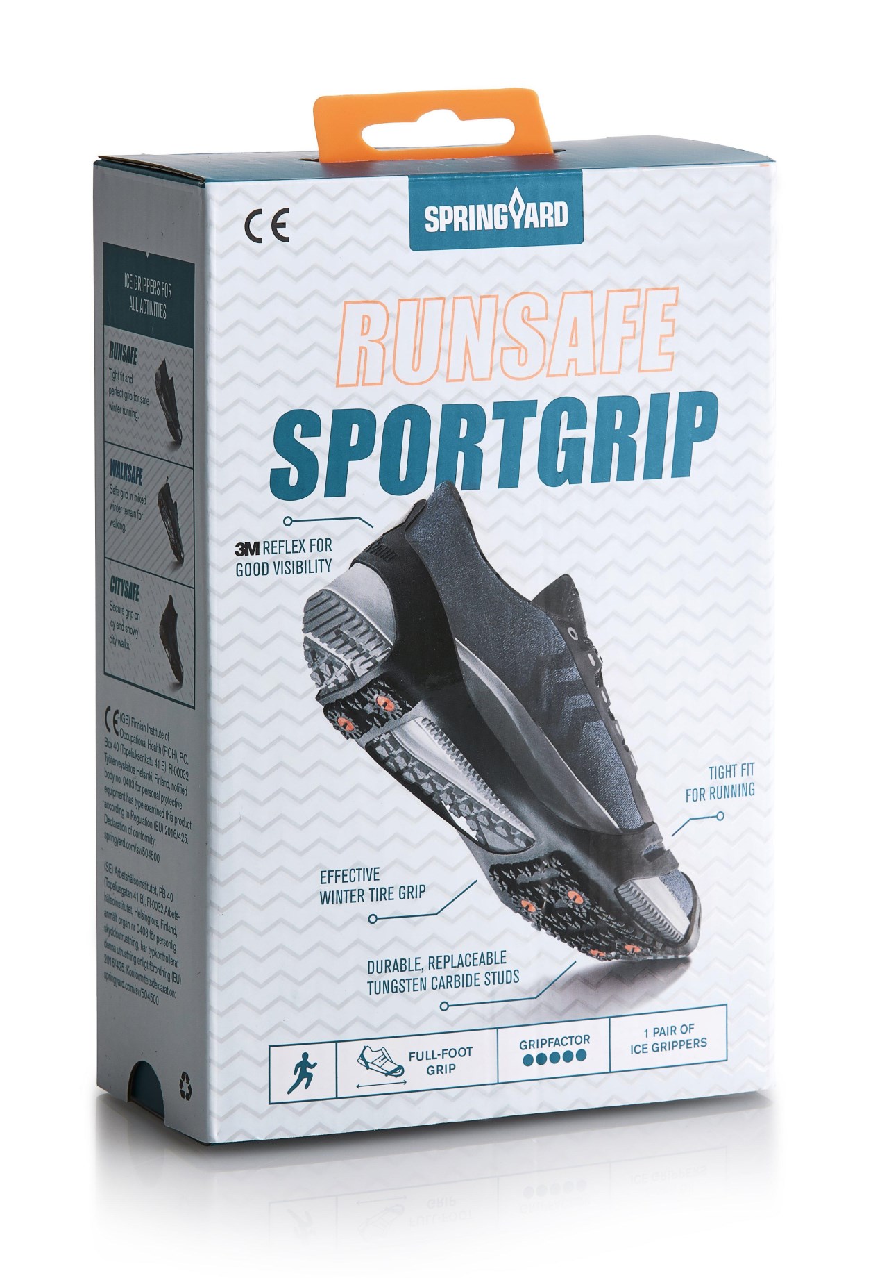 Känn dig säker med Springyard SportGrip Runsafe, ett par broddar med genomtänkt design som passar vid vinterlöpning, på både is och snö. De ger dig ett stabilt grepp och fungerar lika bra på ditt längre pass som vid intervallträning. Med en mönstrad undersida och sex dubbar får du maximalt grepp. SportGrip Runsafe passar alla löparskor och är tillverkade i tåligt naturgummi med slitstarka och utbytbara dubbar i tungstenkarbid. CE-certifierad enligt (EU) 2016/425. Passar alla löparskor!