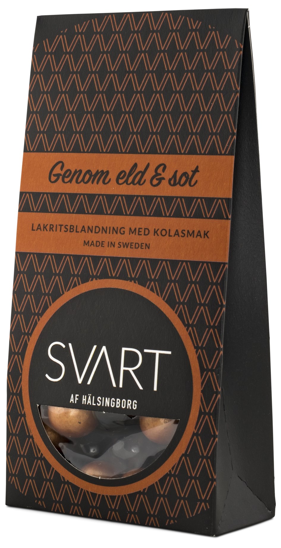 Genom Eld och Sot - En mjuk och god saltlakrits som är dragerad i både vit- och mjölkchoklad. Hälften av bollarna med smak av saltlakrits och lakritspulver och resten med smak av saltlakrits och kola.