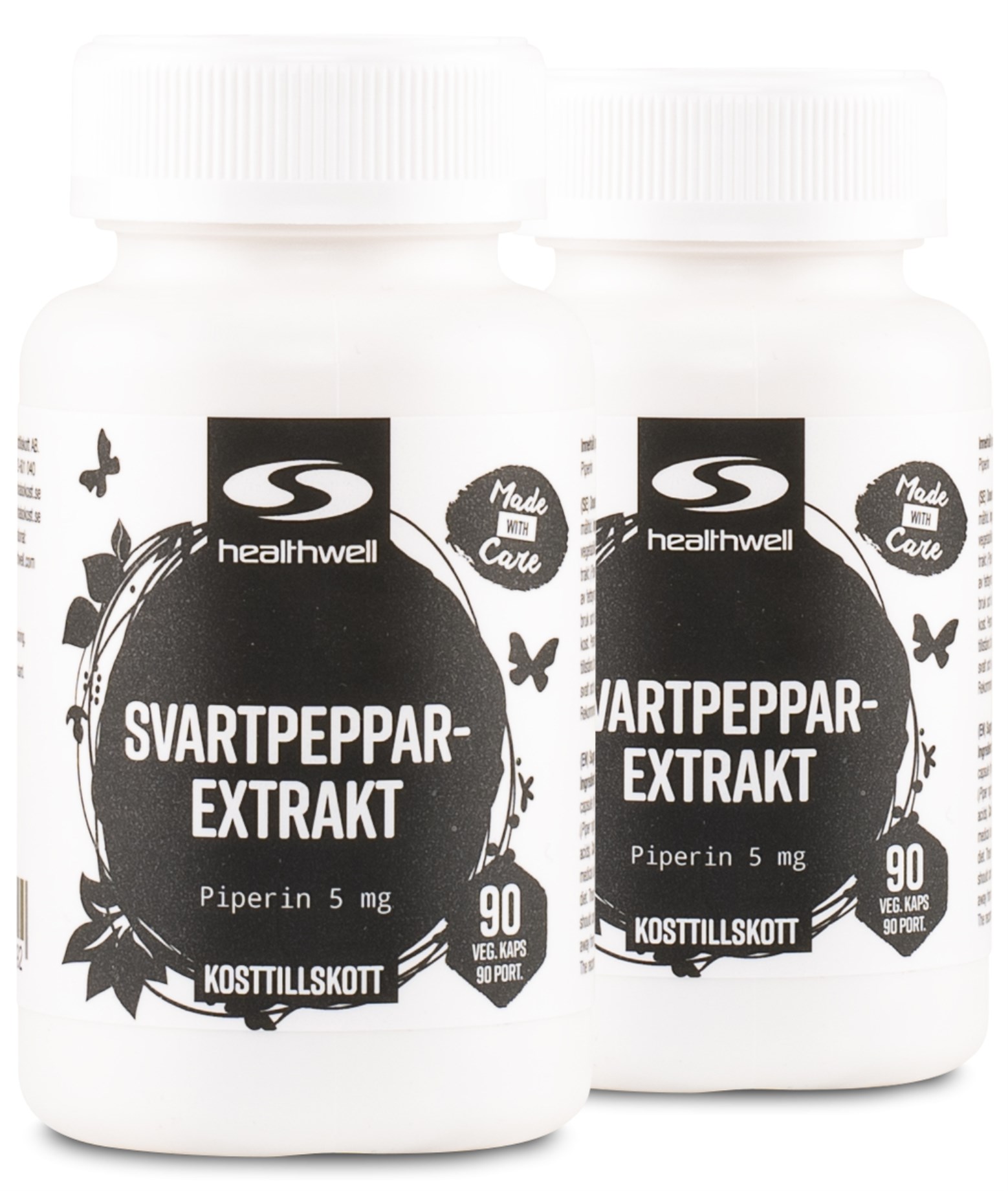 Healthwell Svartpeppar Extrakt är ett vegetabiliskt tillskott med svartpepparextrakt (Piper nigrum), med hög halt piperin. Piperin anses vara det aktiva ämnet i svartpeppar som hjälper till att främja upptaget av vissa näringsämnen. En kapsel Svartpepparextrakt Piperin innehåller 5 mg piperin och rekommenderas att tas före måltid för bästa effekt.