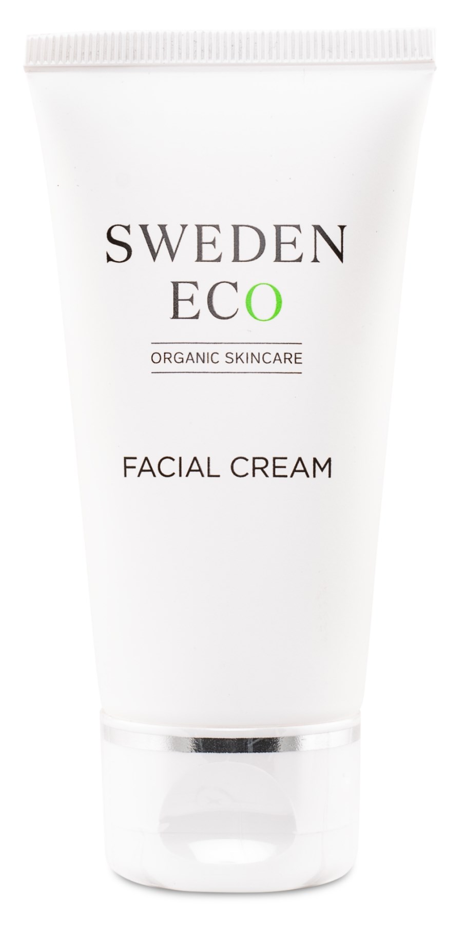 Organic Skincare Facial Cream från Sweden Eco Skincare är en naturlig dag- och nattkräm som absorberas lätt och lämnar huden återfuktad, len och smidig. Den skyddar, vårdar och bidrar till att reducera tecken på trötthet och livlöshet i huden med hjälp av rättvisemärkt aloe vera. Innehåller parakrasse, vilket dokumenterat visat sig öka hudens fasthet och minska synliga linjer. Krämen har en mild fruktig doft.