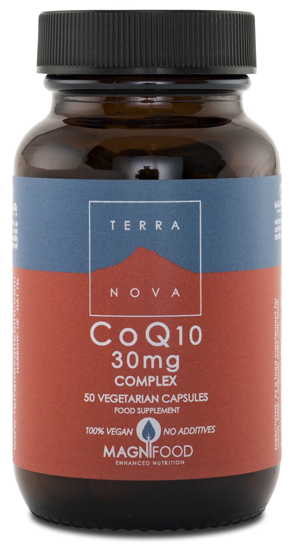 Terranova CoQ10 Complex innehåller coenzymet Q10 som är känt för sin antioxidanta effekt och kan motverka oxidativ stress. Q10 finns naturligt i alla kroppens celler och framförallt i de organ som förbrukar mycket energi, som till exempel hjärtat, njurarna och levern. Produktionen av Q10 minskar i kroppen när vi åldras och kan därför vara intressant att tillsätta eftersom det bidrar till en normal hjärt- och kärlhälsa samt till immunsystemet.