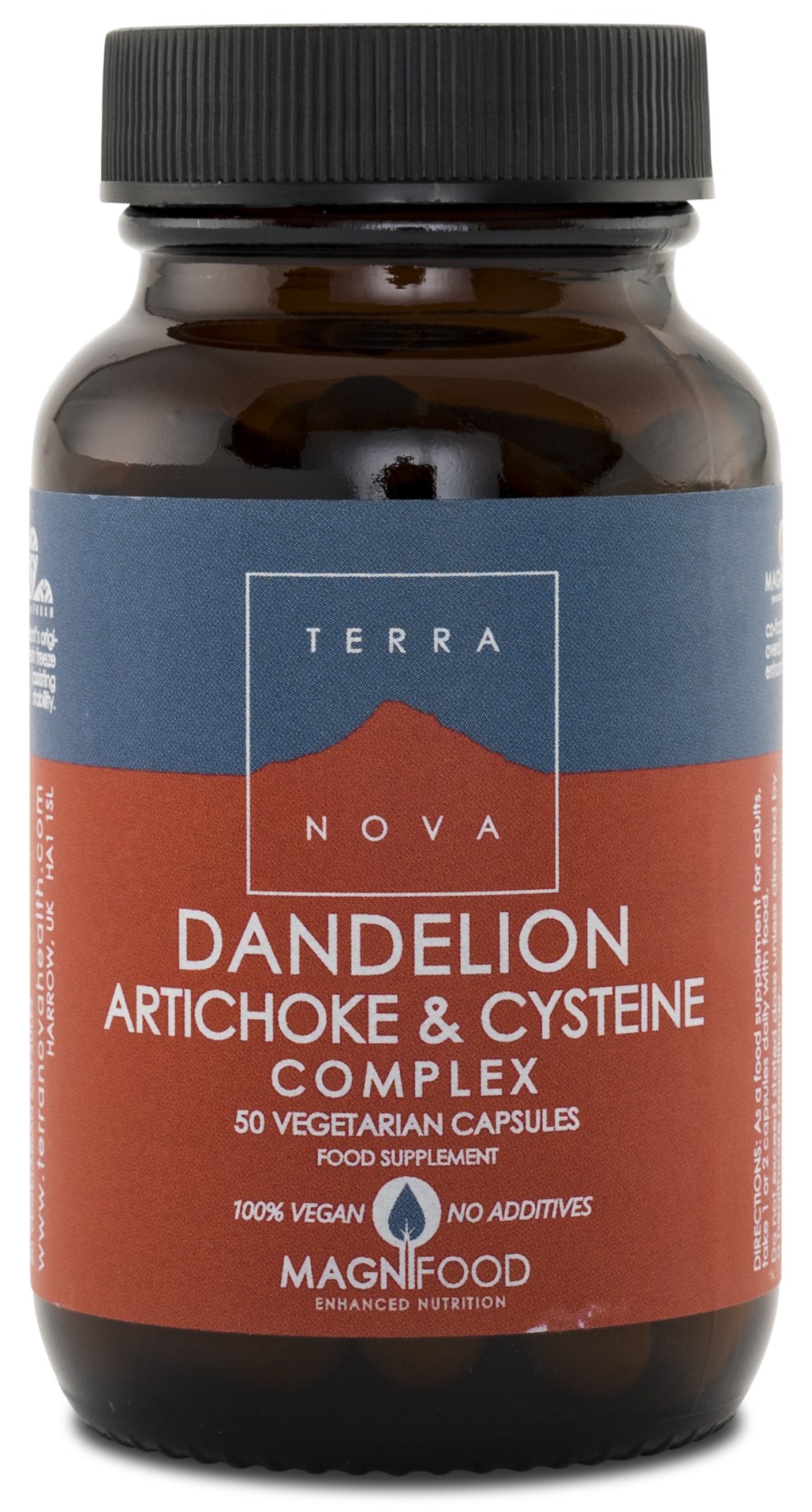 Terranova Dandelion, Artichoke & Cystein Complex är ett naturligt kosttillskott med en unik sammansättning av maskros, kronärtskocka och cystein. Maskros är en ört som har ett naturligt innehåll av bitterämnen och mineraler och anses kunna ha en positiv inverkan på matsmältningen, vilket även kronärtskocka anses ha. L-Cystein är en svavelbärande aminosyra som kroppen även tillverkar på egen hand och finns naturligt i hår, hud och naglar. Terranova Dandelion, Artichoke & Cysteine Complex innehåller även gurkmeja, grönt te, grönkål, korngräs och stabiliserat riskli.