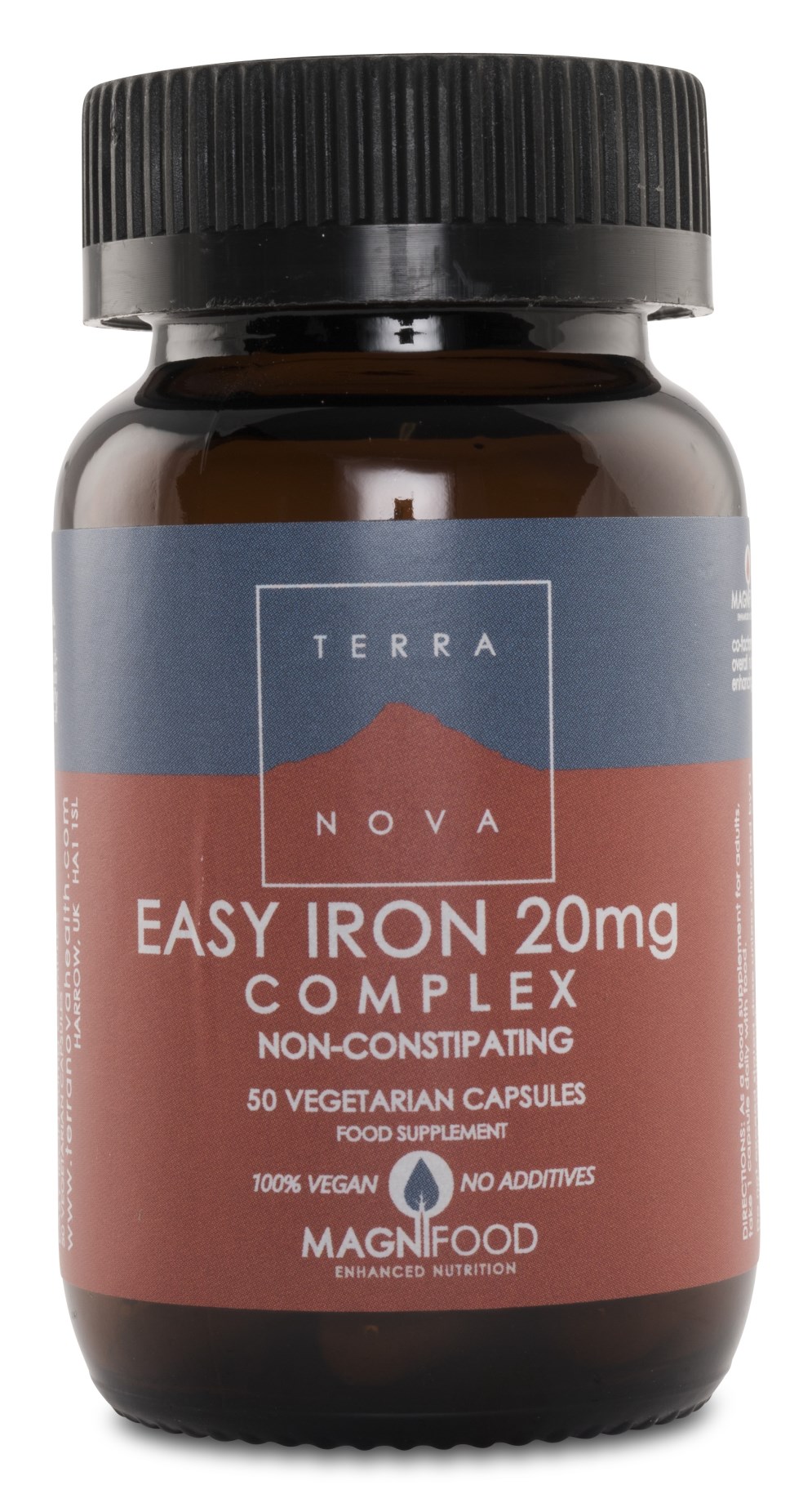 Terranova Järn, eller Easy Iron Complex som den heter på originalspråk, är ett järntillskott med 20 milligram järn per kapsel av formen järnbisglycinat, som är skonsammare för magen. Förutom järn innehåller detta järntillskott grönt korngräs som har hög järnhalt men även är rik på klorofyll och folsyra som har en viktig del i hemoglobinets bildande. Terranova Järn innehåller även stabiliserat riskli som har höga halter av E-vitamin. Men huvuduppgiften för riskli i denna produkt är för att kompensera den oxidativa effekten järn har på vitamin E. Spannmålsfibrer kan försämra upptaget av järn i kroppen men inte Terranova Järn, då Terranova använder sig av järnbisglycinat, som även är skonsammare för magen.