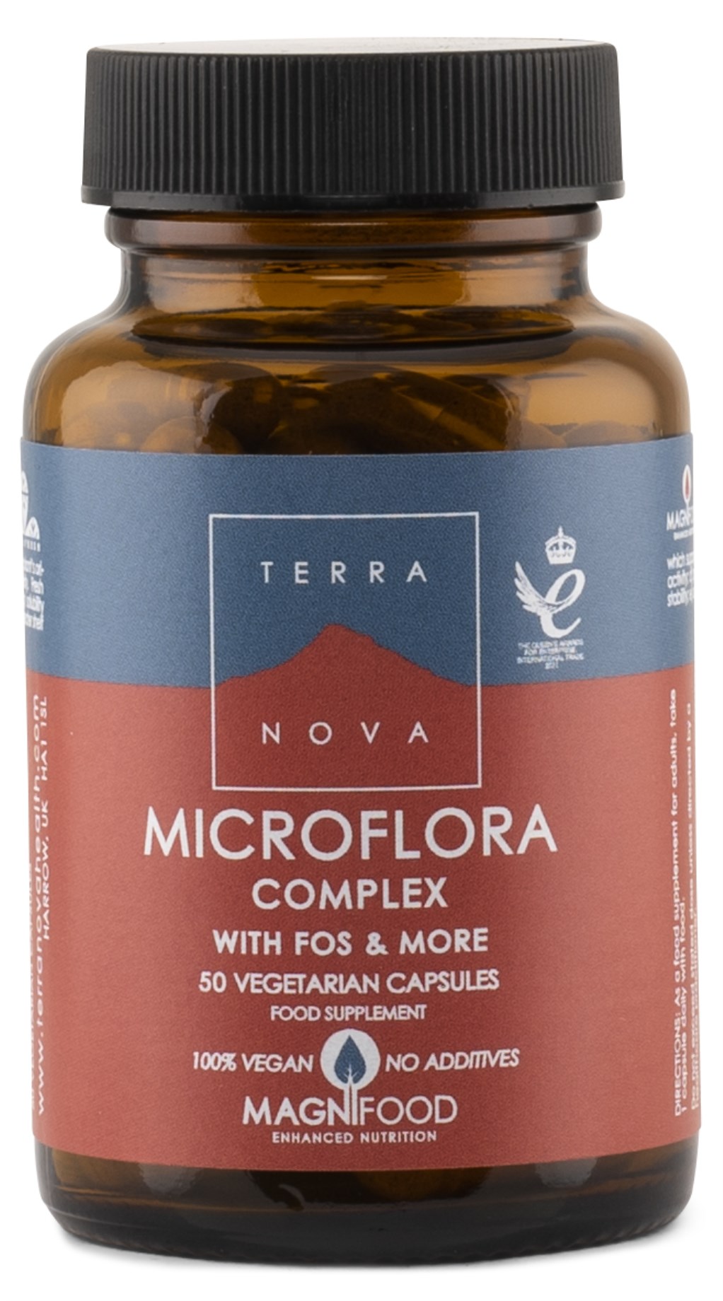 Terranova Microflora Complex innehåller en örtblandning Magnifood® Complex som innefattar fruktooligosackarider (FOS) från riskli och kardborre. FOS fungerar som en icke-smältbar kolhydrat och förbättrar aktiveringen i bakteriefloran i tarmen. Riskli är ett spannmål som innehåller både lösliga och olösliga former av fibrer som hjälper till att hålla matsmältningssystemet i balans. Kardborre är en växt med probiotiska egenskaper och innehåller en väldigt hög andel av FOS som är lämpligt för tarmbakteriefloran.